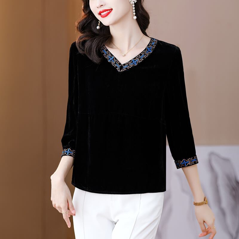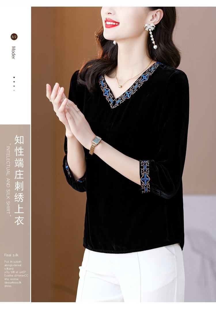 ゴールドベルベットシャツ オータムウィンタールーズ薄手刺繍トップス 大きめサイズ 秋物 冬物 muto1328614014