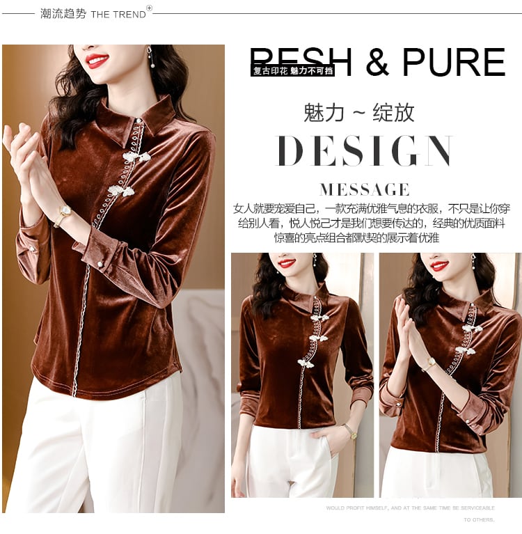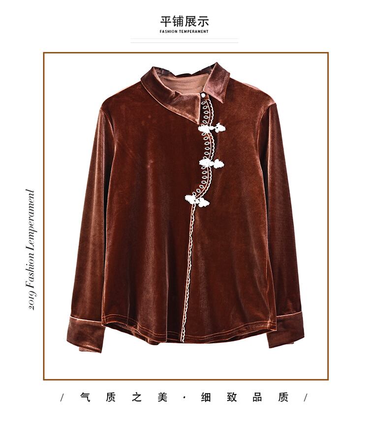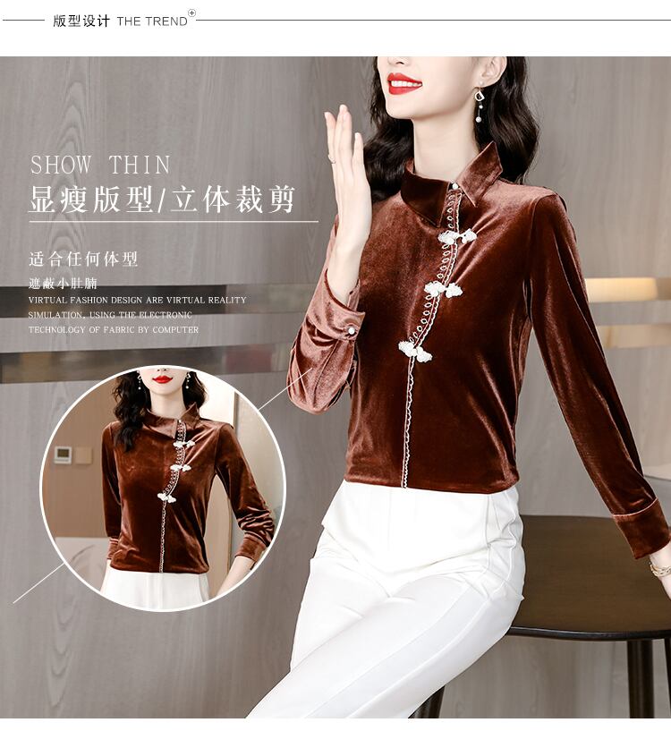 ゴールドベルベットシャツ オータムウィンタースリムフィット薄手バックルトップス 大きめサイズ 秋物 冬物 muto76740983145