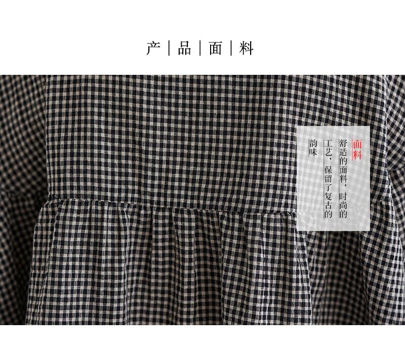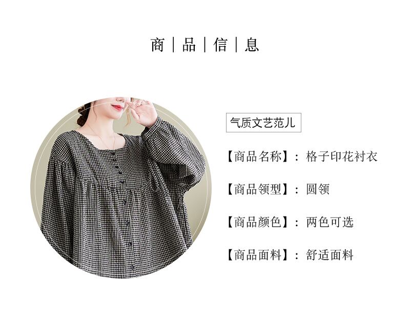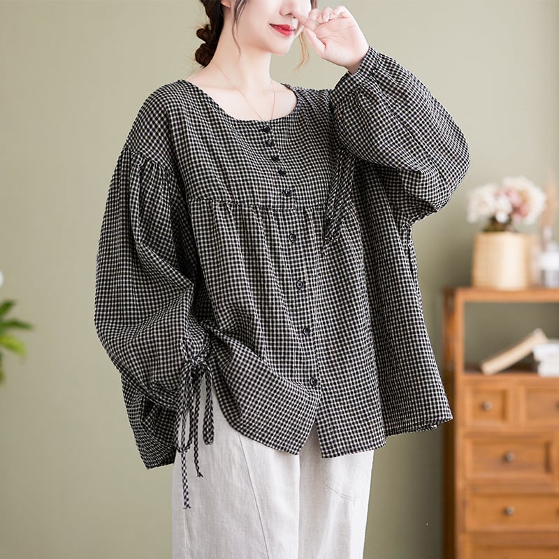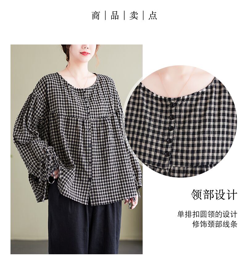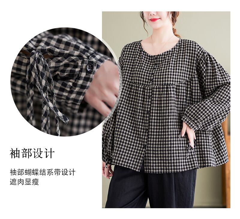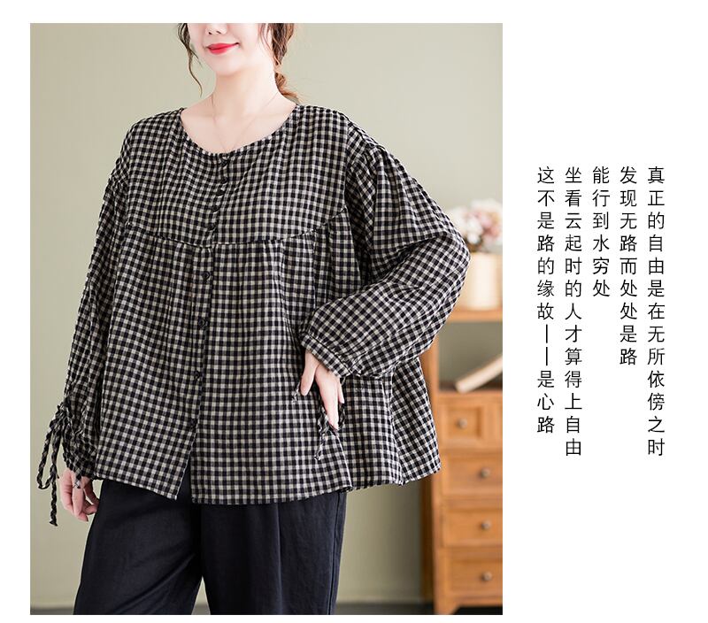 シャツ スプリングオータムスタンダード格子柄トップス ロング コットン レトロ レース 大きめサイズ 春物 秋物 レースアップ muto9179134301