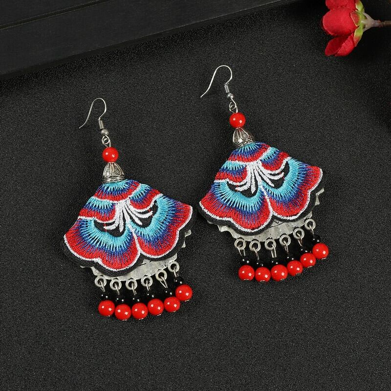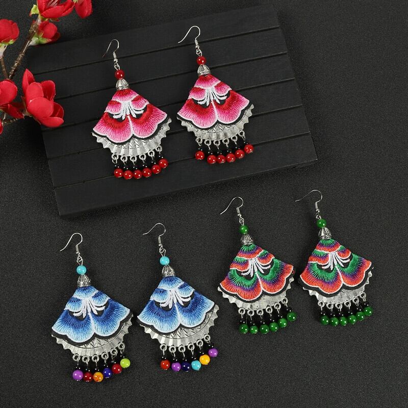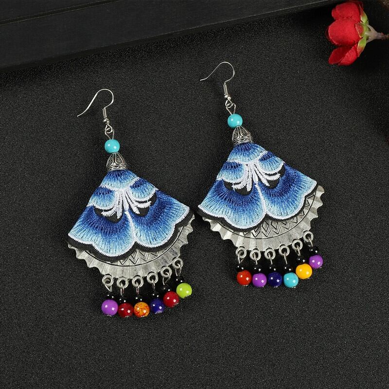 少数民族エスニックスタイルの刺繍生地のイヤリングロングセクション電話人格扇形のイヤリングレトロミャオ族の花のイヤリング 指輪 フラワーデザイン shipin64660885004