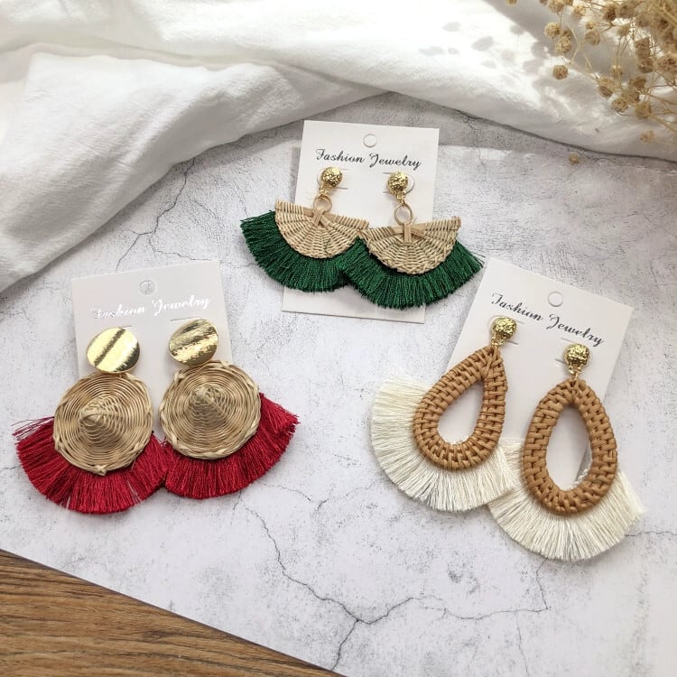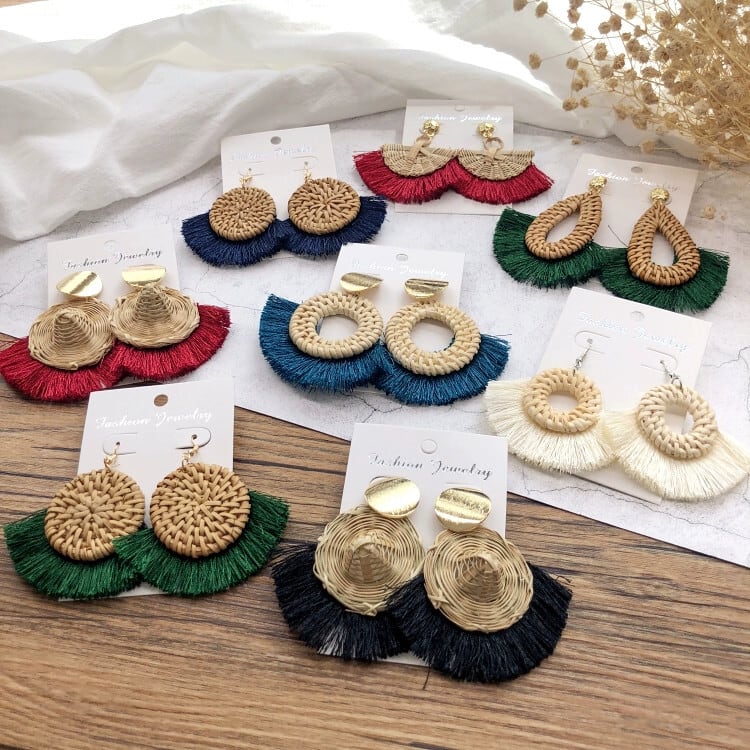 色:1-籐麦わら帽子(ピーコックブルー),2-籐麦わら帽子(黒),3-籐麦わら帽子(オフホワイト),4.籐麦わら帽子(深紅),5-籐麦わら帽子(ダークグレー),6-ラタンダイヤモンド(クリムゾン),7本籐菱形(ウッドグリーン),8籐扇子(オフホワイト),9本籐扇子(ウッドグリーン),10籐扇子(ダークレッド),11籐水滴(黒),12籐水滴(オフホワイト),13籐水滴(ウッドグリーン),14.ラタンウォーター(クリムゾン),15-籐小丸(ローズレッド),16-籐小丸(オフホワイト),17-籐小丸(ウッドグリーン),18籐小丸(ダークレッド),19籐ディスク(サファイアブルー),20籐ディスク(オフホワイト),21籐ディスク(木製グリーン),22籐ディスク(ダークレッド),23-ラタンサークルスタッドピアス(ピーコックブルー),24籐サークルイヤリング(オフホワイト),25-ラタンサークルスタッドピアス(グリーン),26-ラタンサークルスタッドピアス(レッド),27籐菱形(オフホワイト),28籐ひし形(ローズレッド)