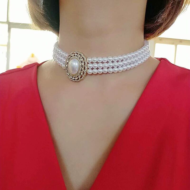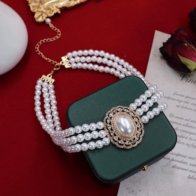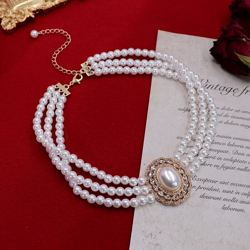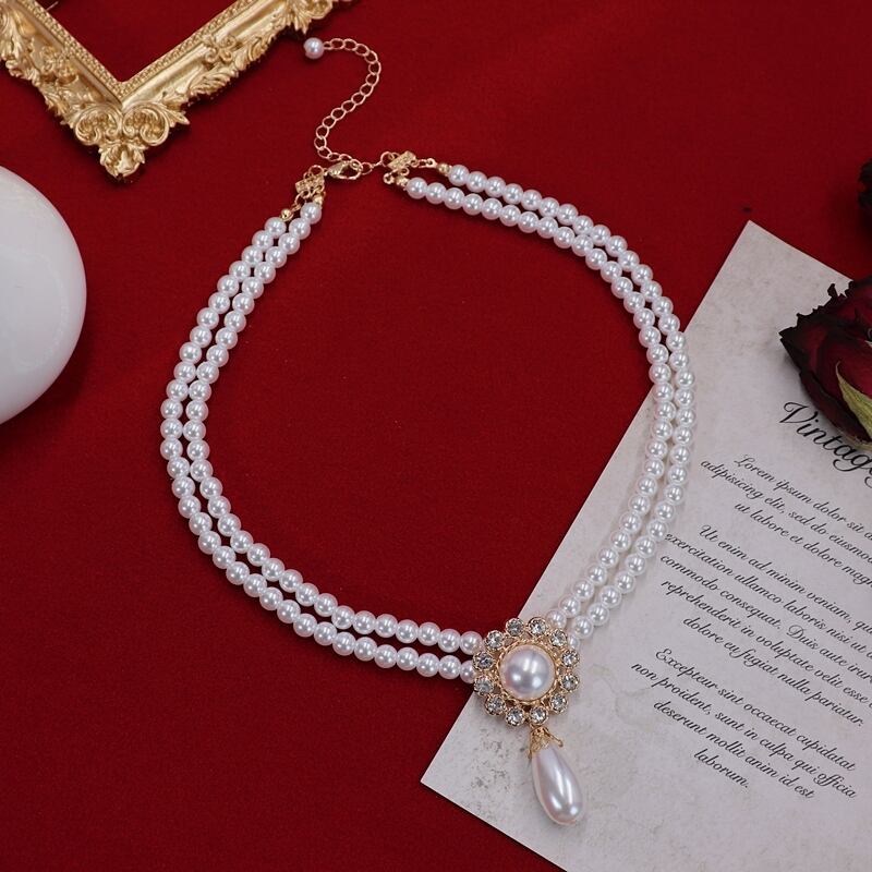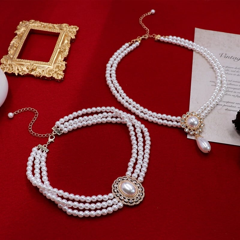 レトロヘボンパールネックレスパーティー気質多層鎖骨チェーンニッチネックレスチャイナドレスアクセサリー レース 真珠 shipin6775042066