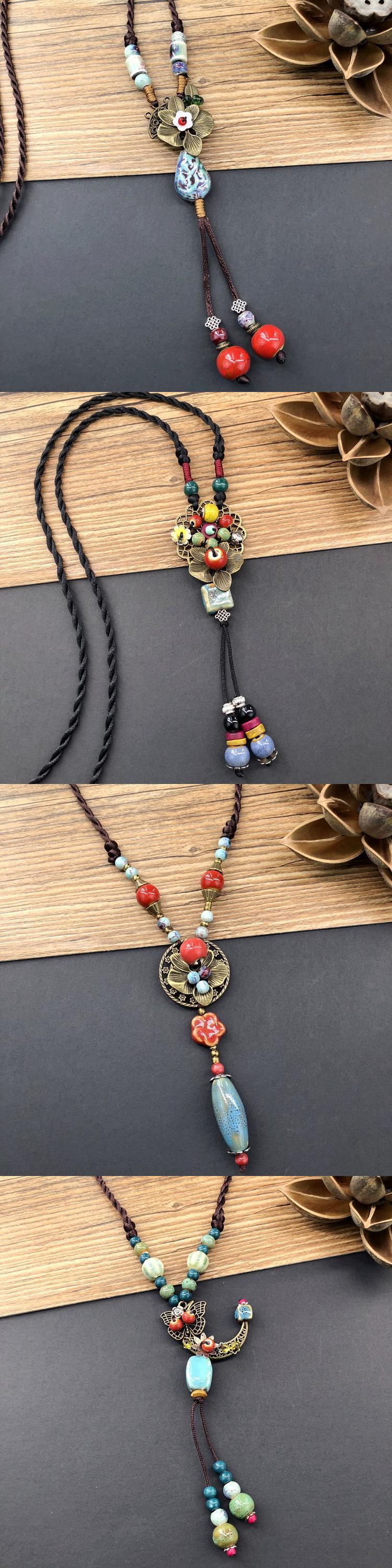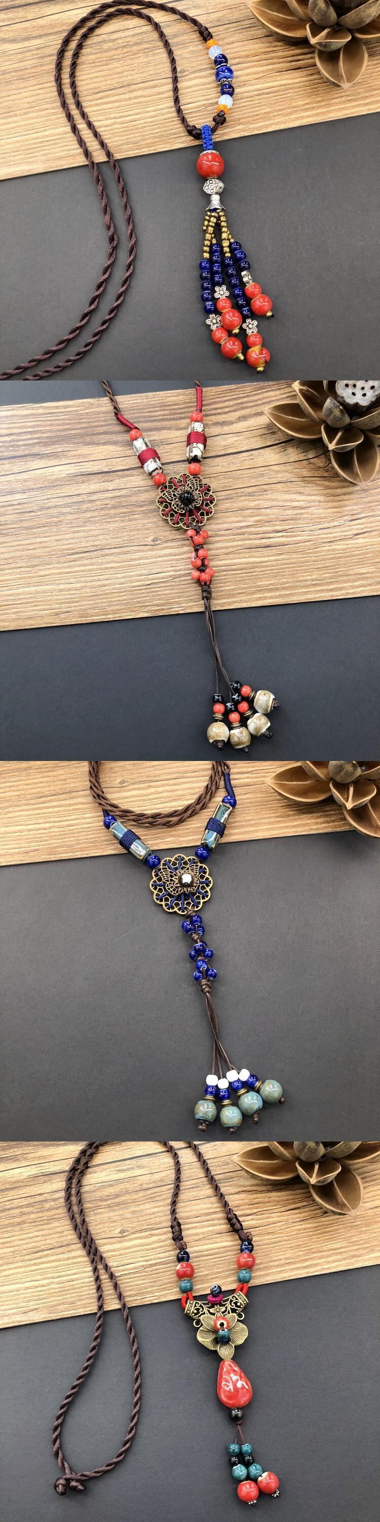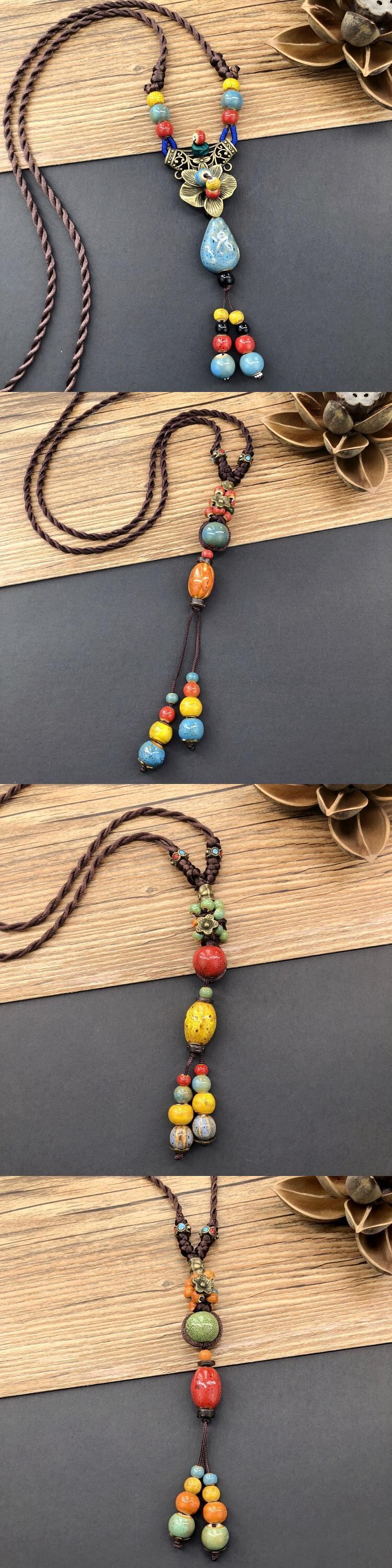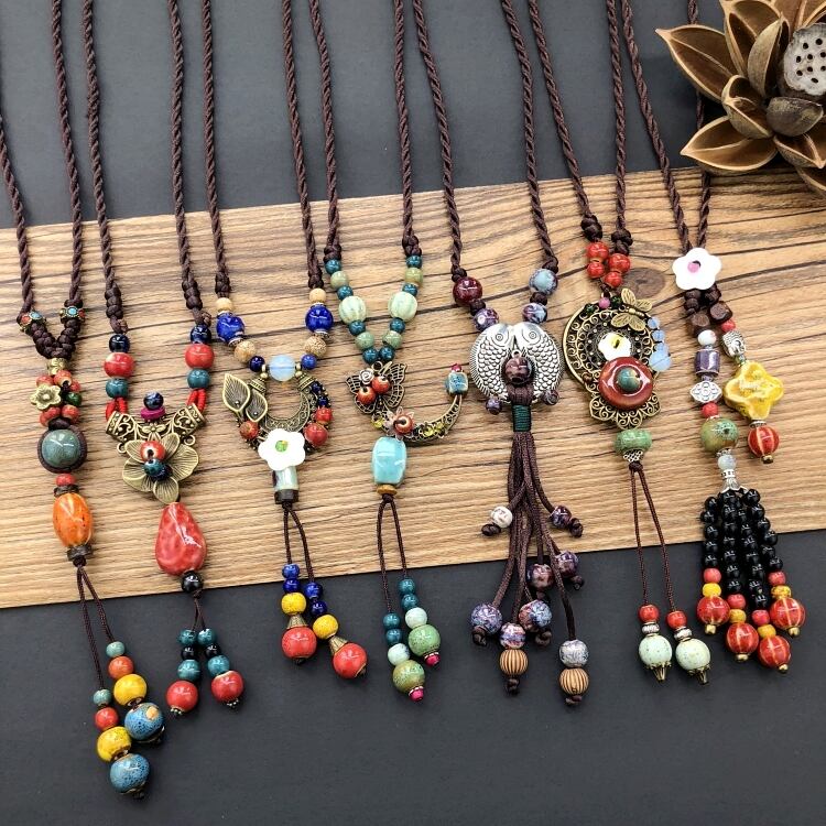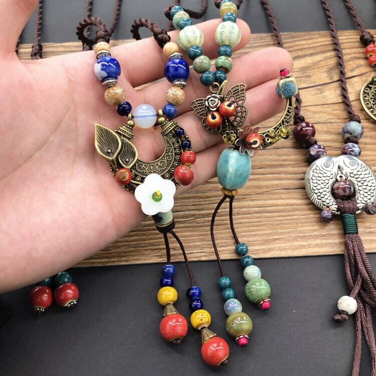 エスニックスタイルレトロ文学コットンリネンセラミックネックレス女性森オールマッチロングセーターチェーン電話ペンダントアクセサリー レース shipin99511121381