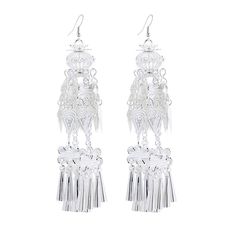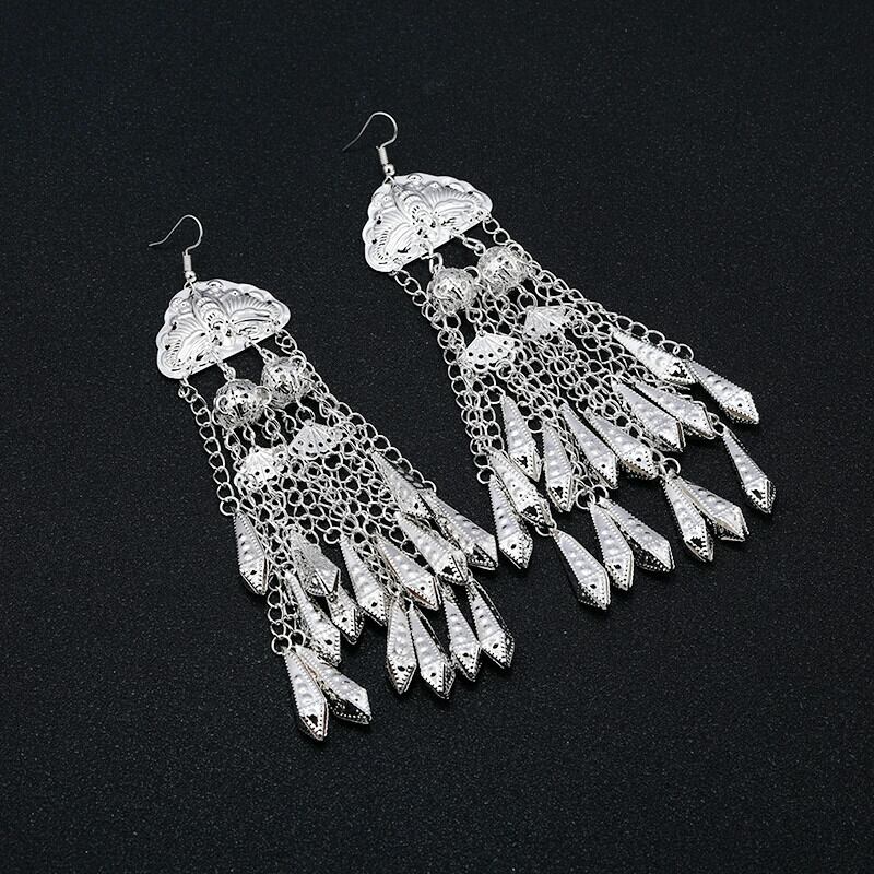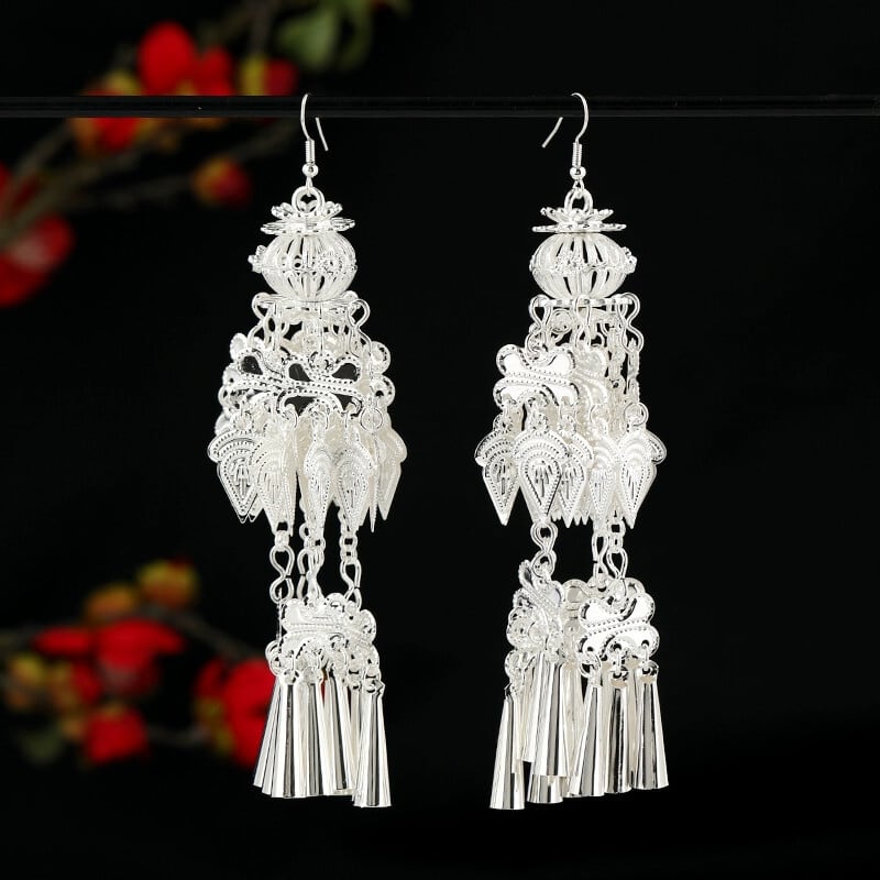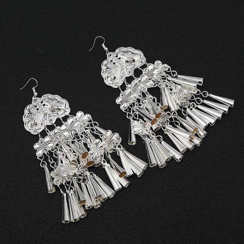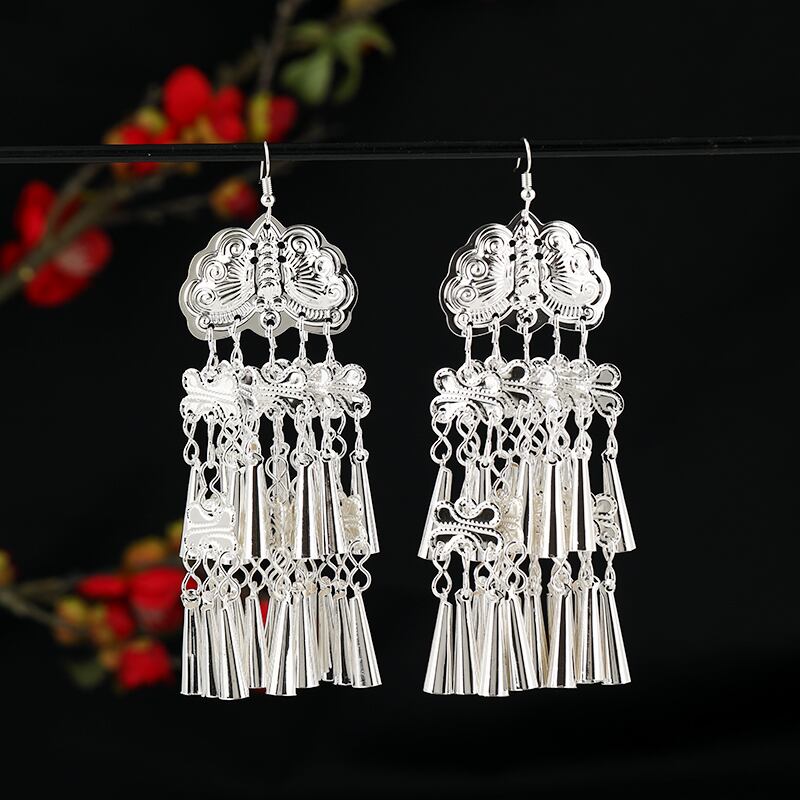 エスニックスタイルミャオ族シルバーテルイヤリングレトロ人格雲南ミャオ族誇張ロングベルイヤリング女性ダンスイヤリング 指輪 銀 shipin24876778491