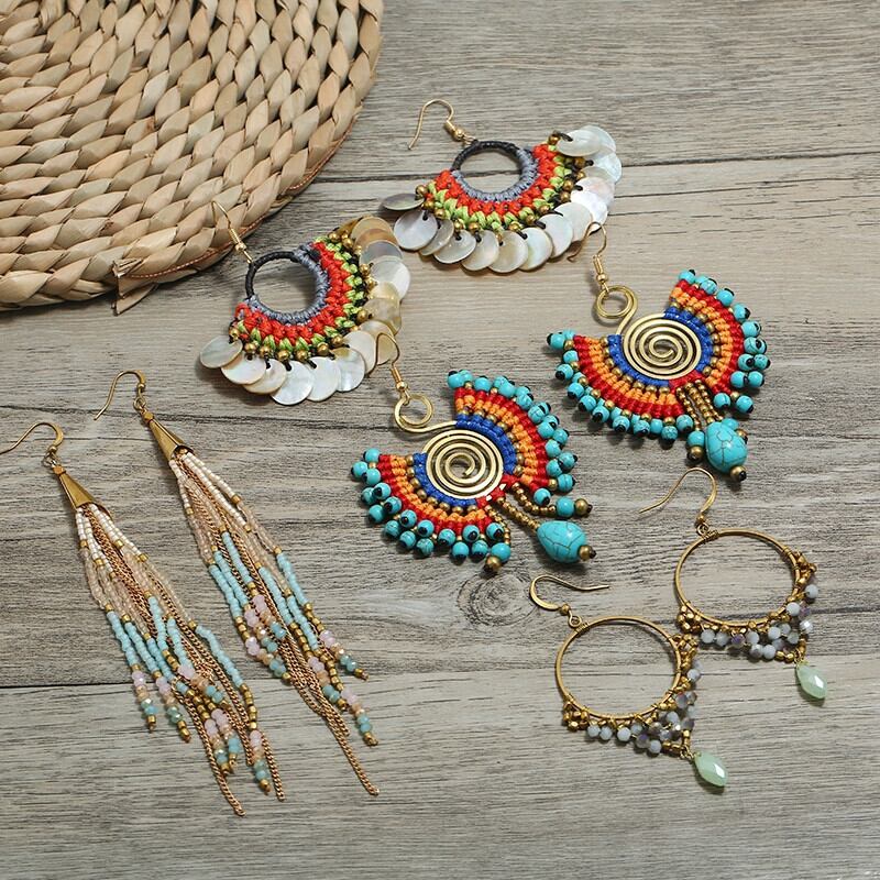 ヨーロッパとアメリカのボヘミアンエスニック風イヤリング手織りレトロ休暇多用途気質イヤリング女性のロングイヤリング 指輪 ヨーロピアン shipin91552026023