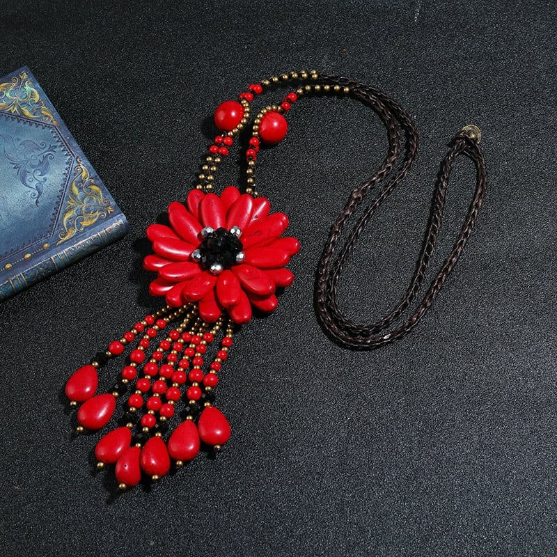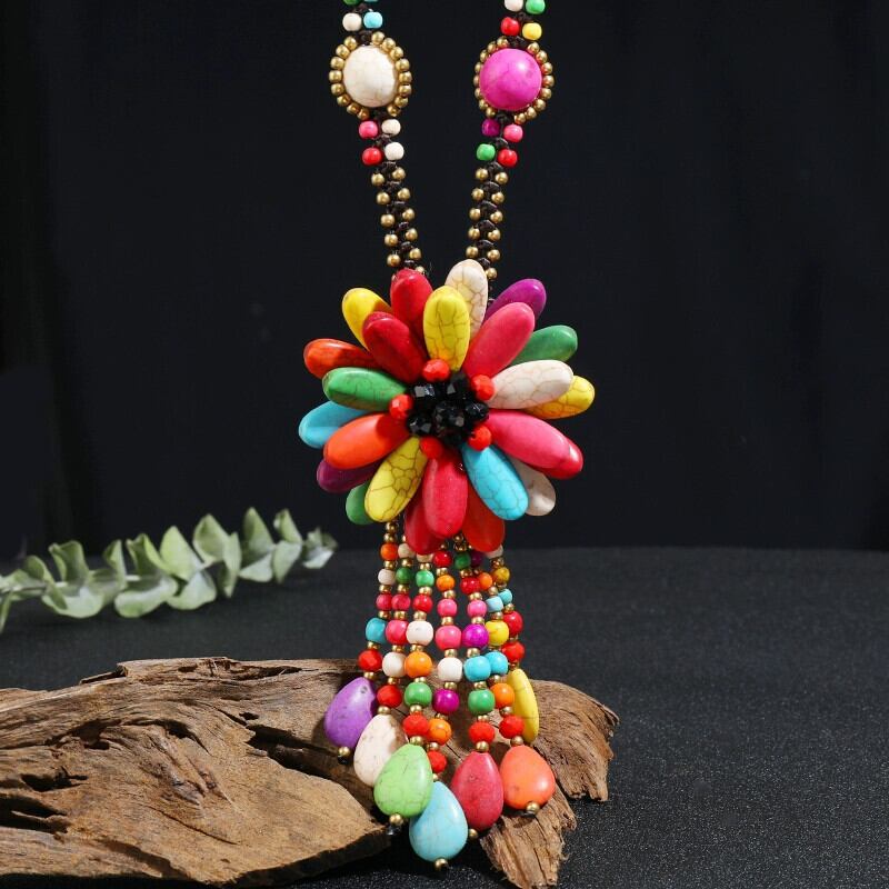 レトロエスニックスタイルロングターコイズフラワーネックレスタイ手作り電話多用途セーターチェーンシンプルなホリデーアクセサリー レース フラワーデザイン shipin57070224858