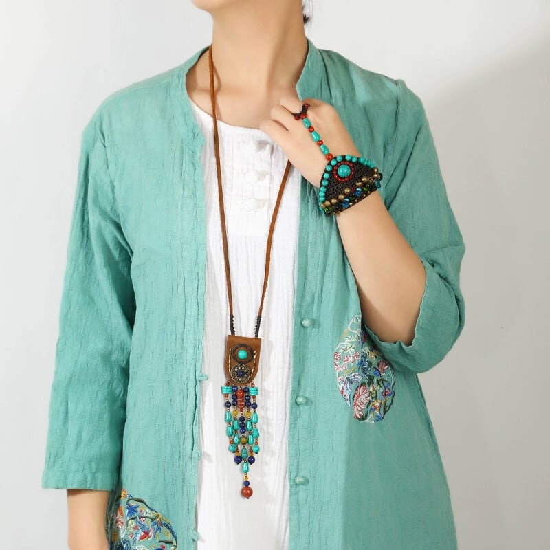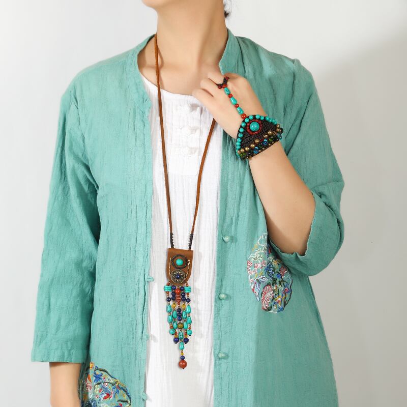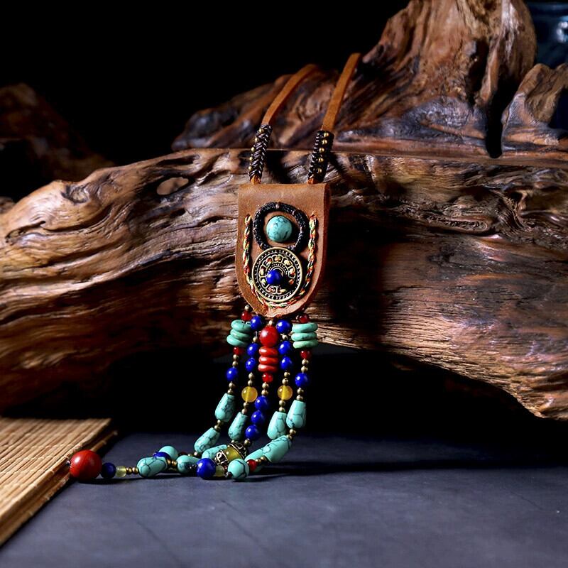 ニッチレトロエスニックスタイルチベットロングネックレスレザーターコイズテルペンダントセーターチェーンホリデージュエリー女性 レース shipin94130007181