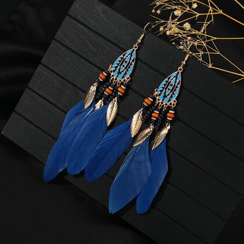 エスニックスタイルレトロフェザーテルイヤリング女性ニッチ人格ボヘミアンブルーロングセクション雲南旅行イヤリング 指輪 shipin96128431917