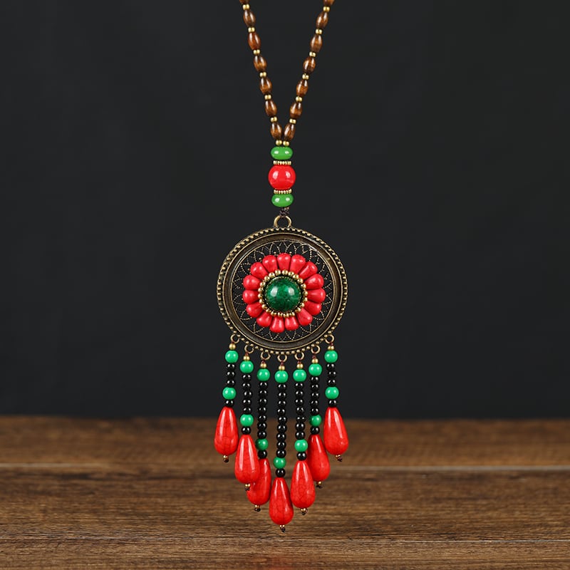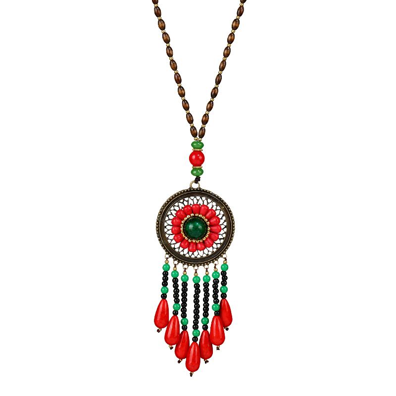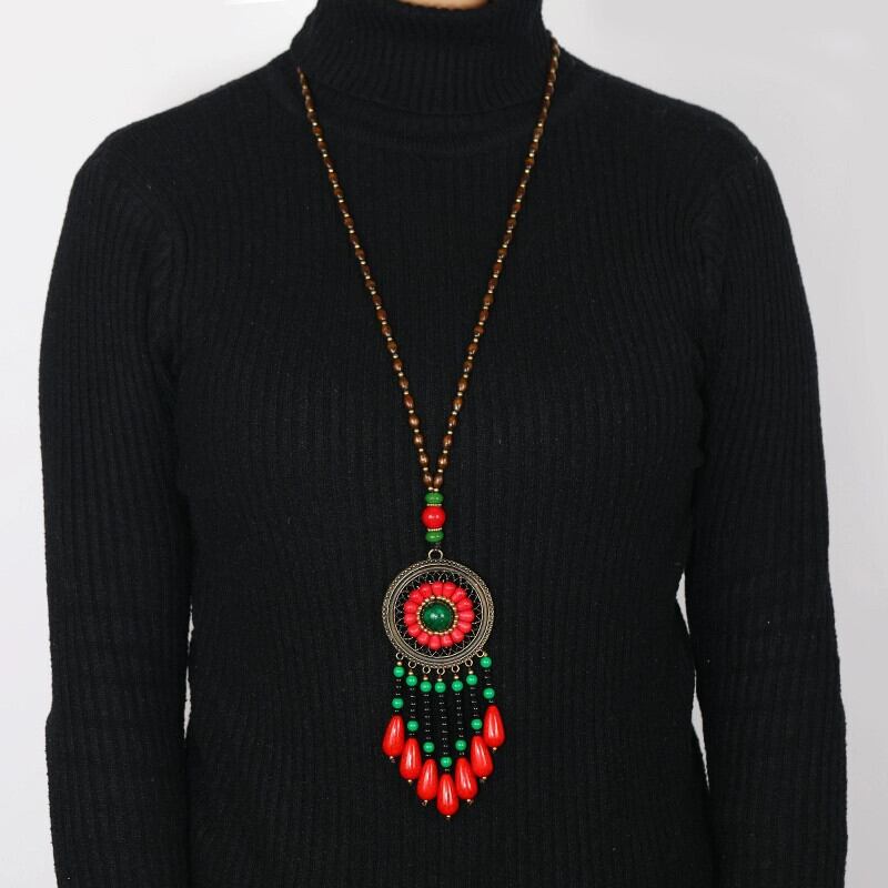 手作りレトロレッドターコイズロングエスニックスタイルネックレス女性のハイエンド気質電話秋と冬のセーターチェーン装飾ペンダント レース オータム 秋物 ウィンター 冬物 shipin8398694795