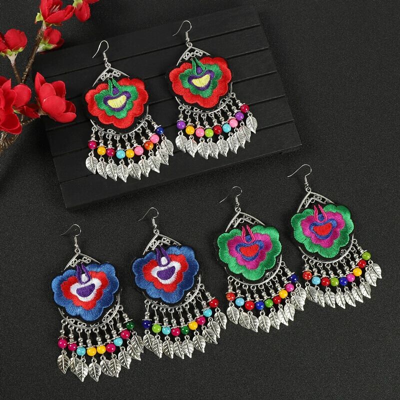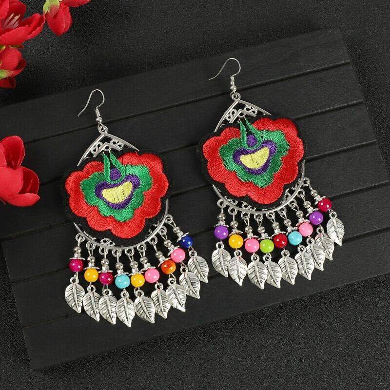 雲南エスニックスタイル両面刺繍生地イヤリングロングリーフ電話人格イヤリングレトロミャオ族イヤリング女性 指輪 shipin20181457555