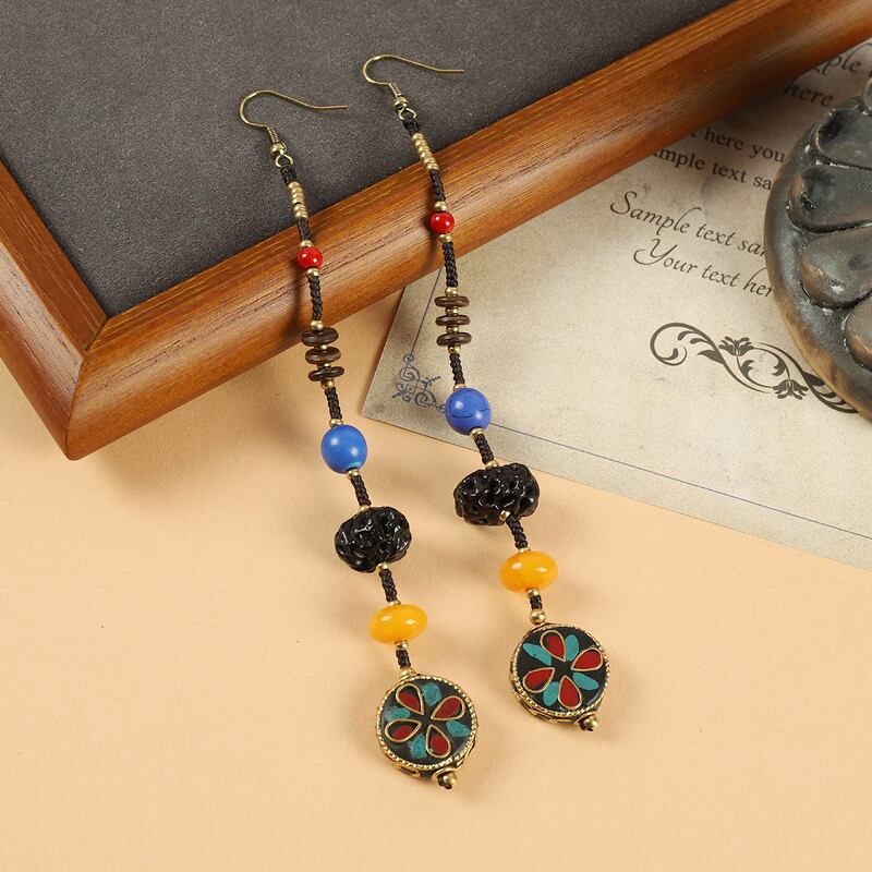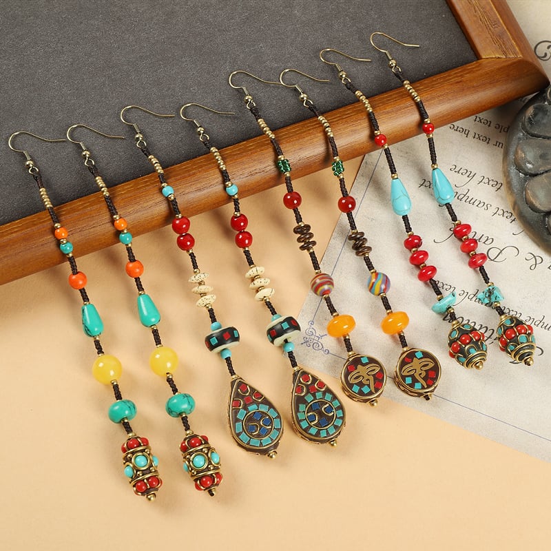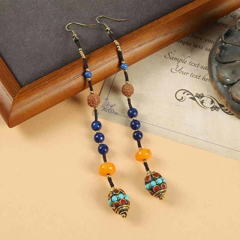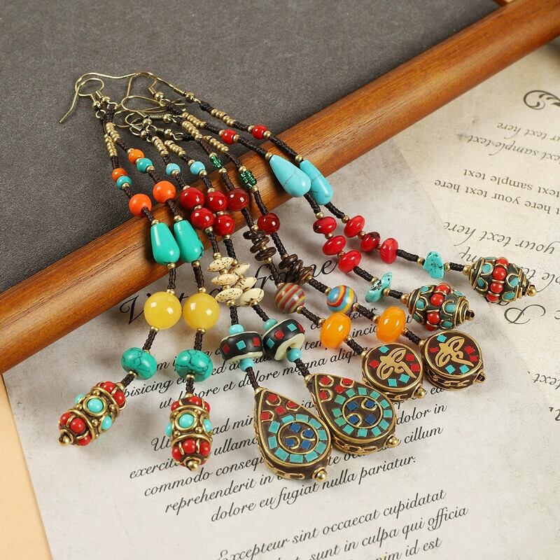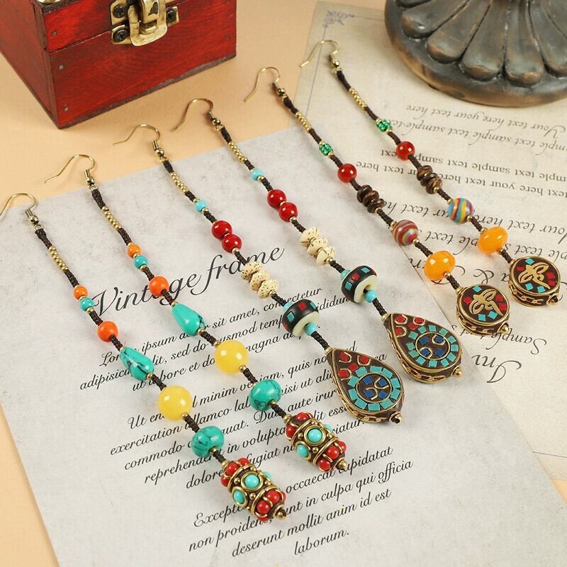 ネパール手作りロングイヤリングレトロ織りチベットエスニックスタイルテルイヤリング女性エキゾチックスタイルシンプルなイヤリング 指輪 shipin25671812274