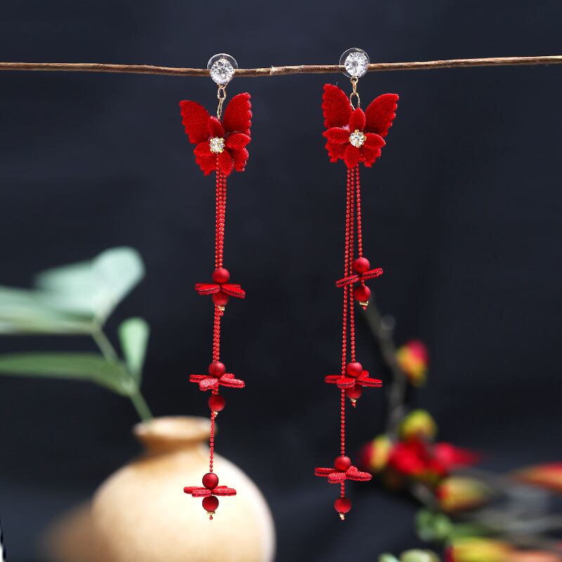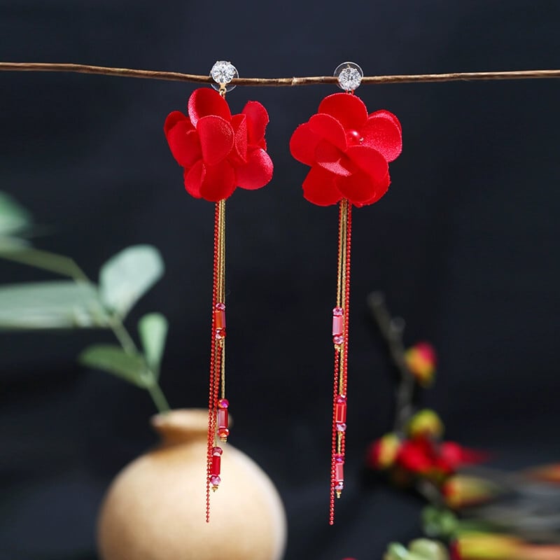 アンティークレッドフラワーイヤリングフェミニニティロングクリスタルテルイヤリングレトロ花嫁韓服耳ジュエリー 指輪 フラワーデザイン shipin32597684276