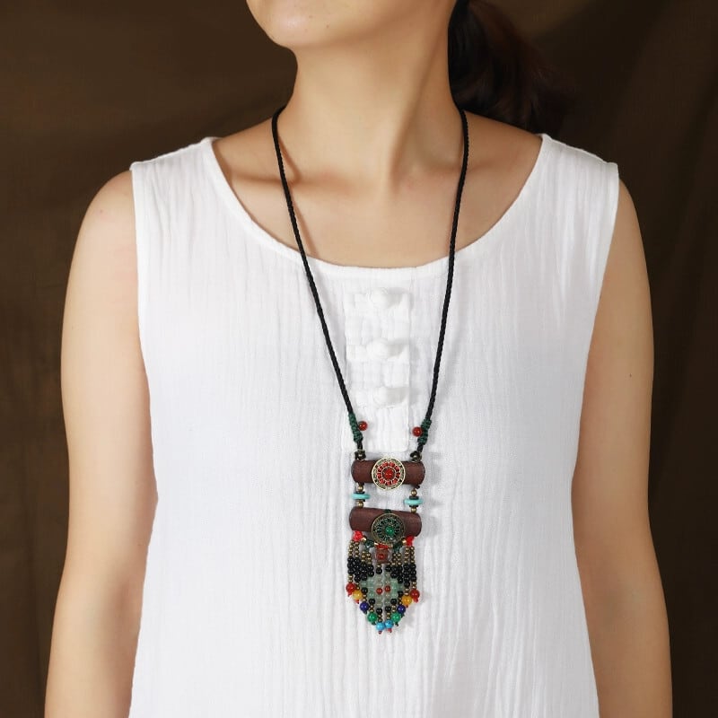 レトロエスニックスタイル電話ネックレス織りロングセクション木製カルセドニーペンダント芸術的な気質セーターチェーンアクセサリー レース shipin55580102729