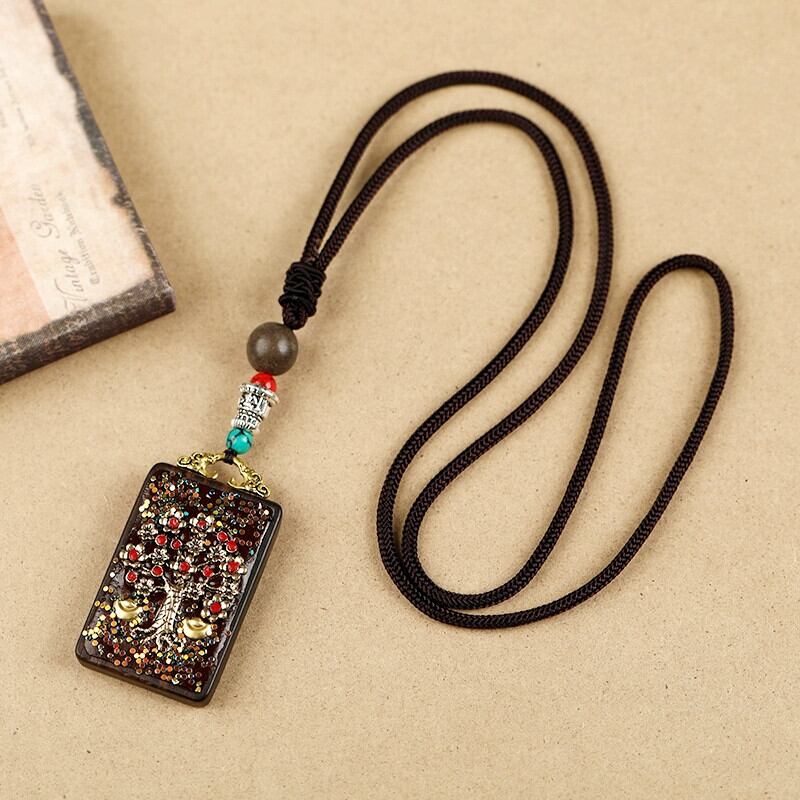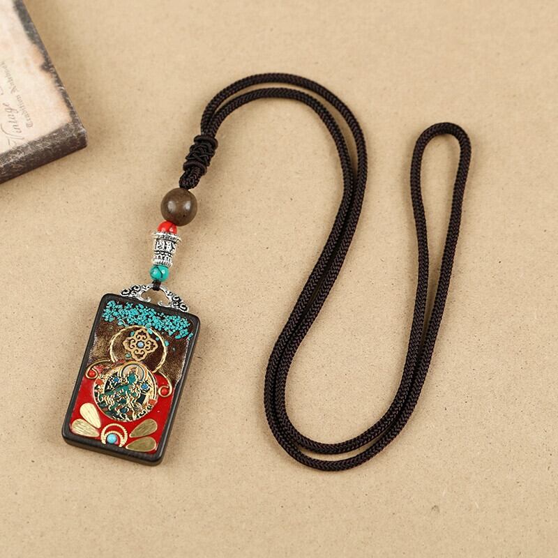 チベットエスニックスタイルタンカカードネックレス黒白檀仏カードペンダント男性と女性のロングセクションシンプルなセーターチェーンレトロアクセサリー ブラック レース shipin61363333543