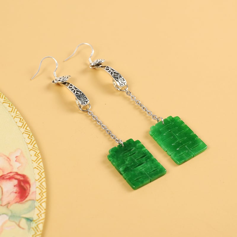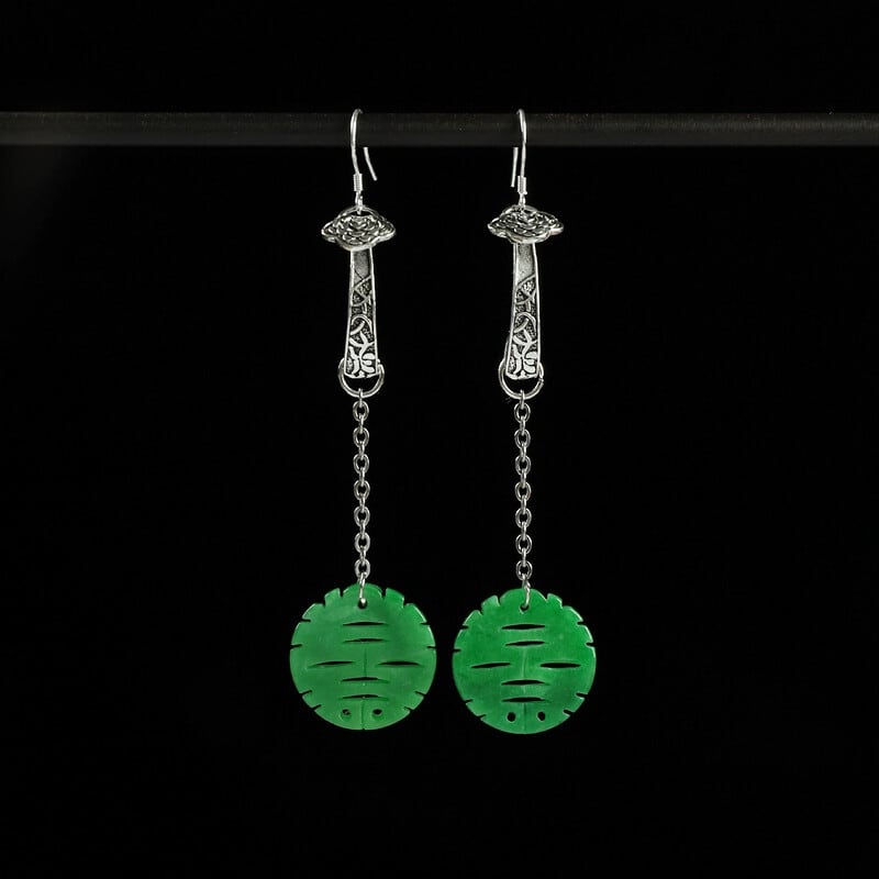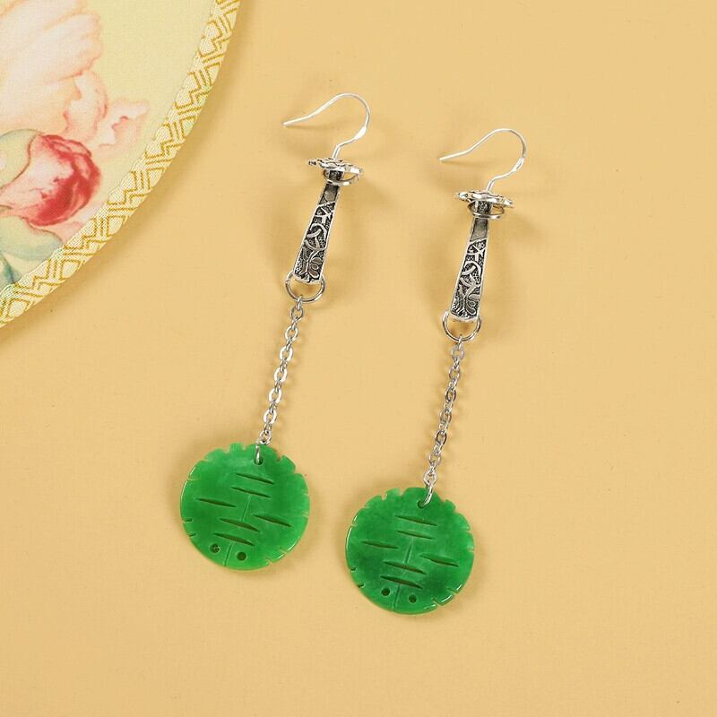 エスニックスタイルイヤリング古代銀翡翠ドライグリーンダブルハピネスキャラクターロングテルイヤリングレトロ気質イヤリング 指輪 シルバー ジェード ヒスイ shipin80005630571