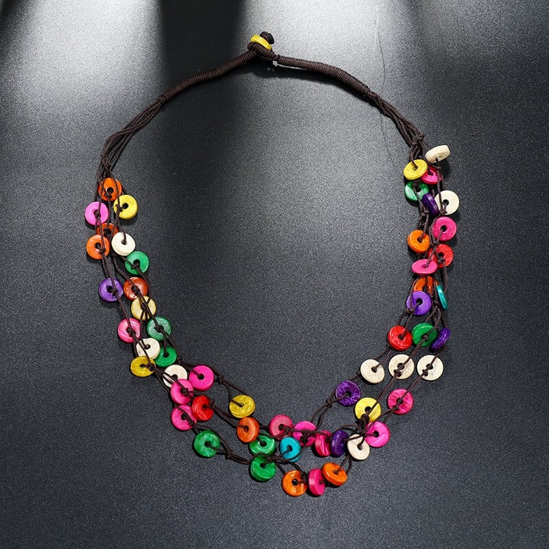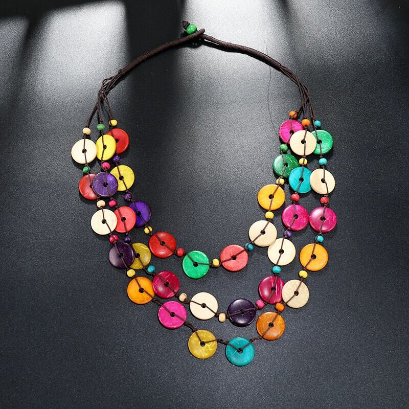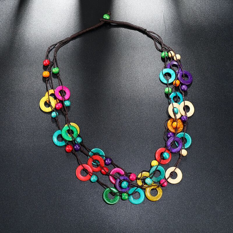 手織りボヘミアンココナッツシェル木製ネックレスレディースエスニックスタイルロングセクション多層カラフルなサークルペンダントアクセサリー レッド レース shipin60504094465