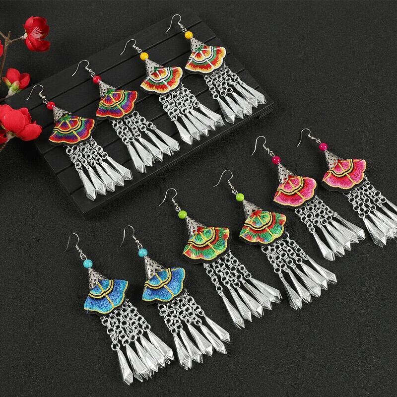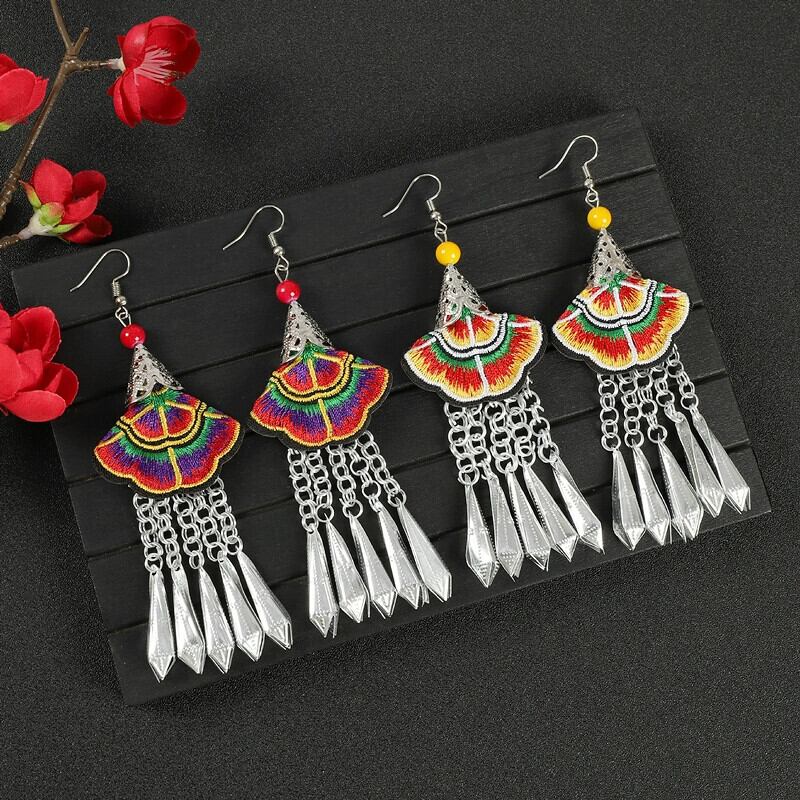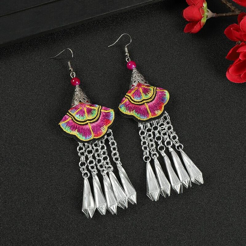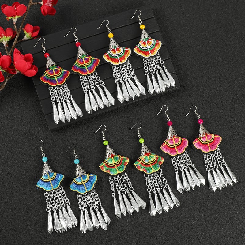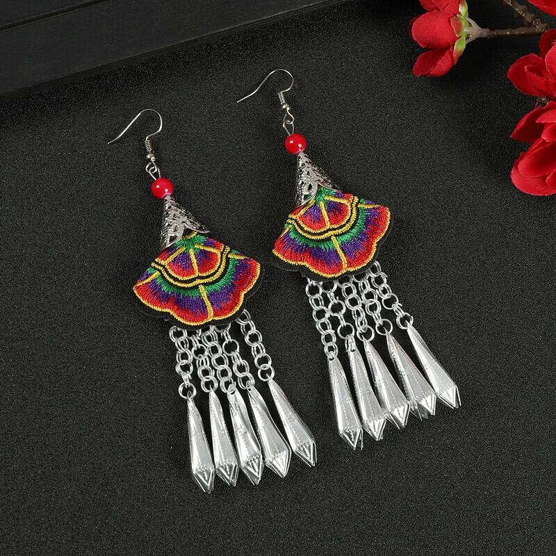 エスニックスタイルの刺繍生地フラワーイヤリングロングミャオ族シルバーテル人格イヤリングレトロミャオ族雲南イヤリング女性 指輪 フラワーデザイン 銀 shipin80712042430