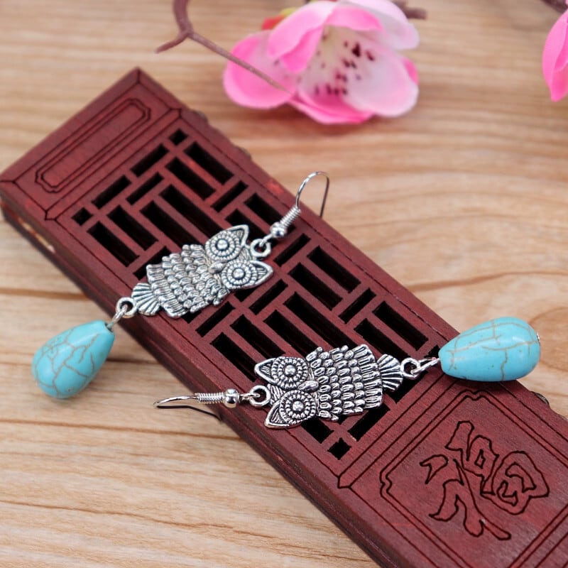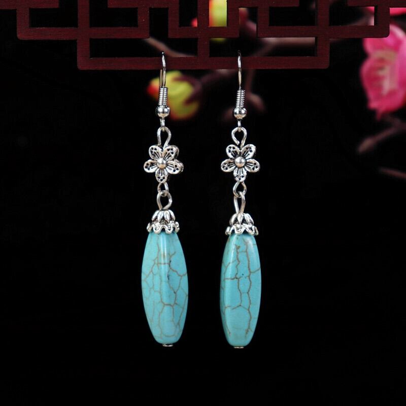 エスニックスタイルレトロオリジナルターコイズイヤリング女性のエレガントなシンプルなフラワーウォータードロップイヤリングロングクリカル耳ジュエリー 指輪 フラワーデザイン shipin96009608170