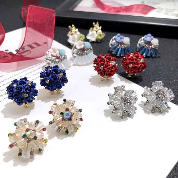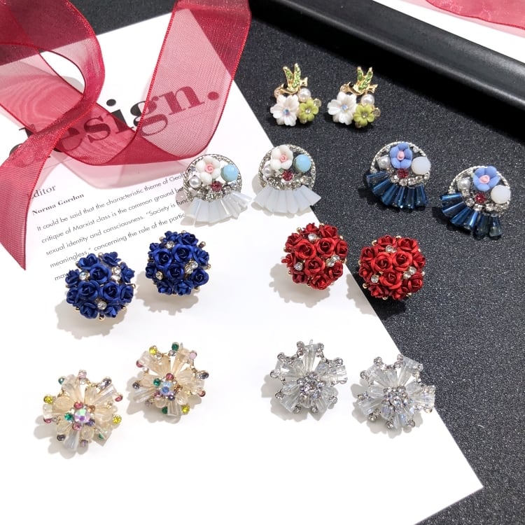色:ローズ(レッドチャーム),ローズ(ブルーエンチャントレス),クリスタルスノーフレーク(ホワイトクリスタルダイヤモンド),クリスタルスノーフレーク(シャンパンカラー),イヤーサイドフラワー(白水晶),イヤーサイドフラワー(ブルークリスタル),繊細なパールピンクの花,チン・ヤン・ホア・イン
