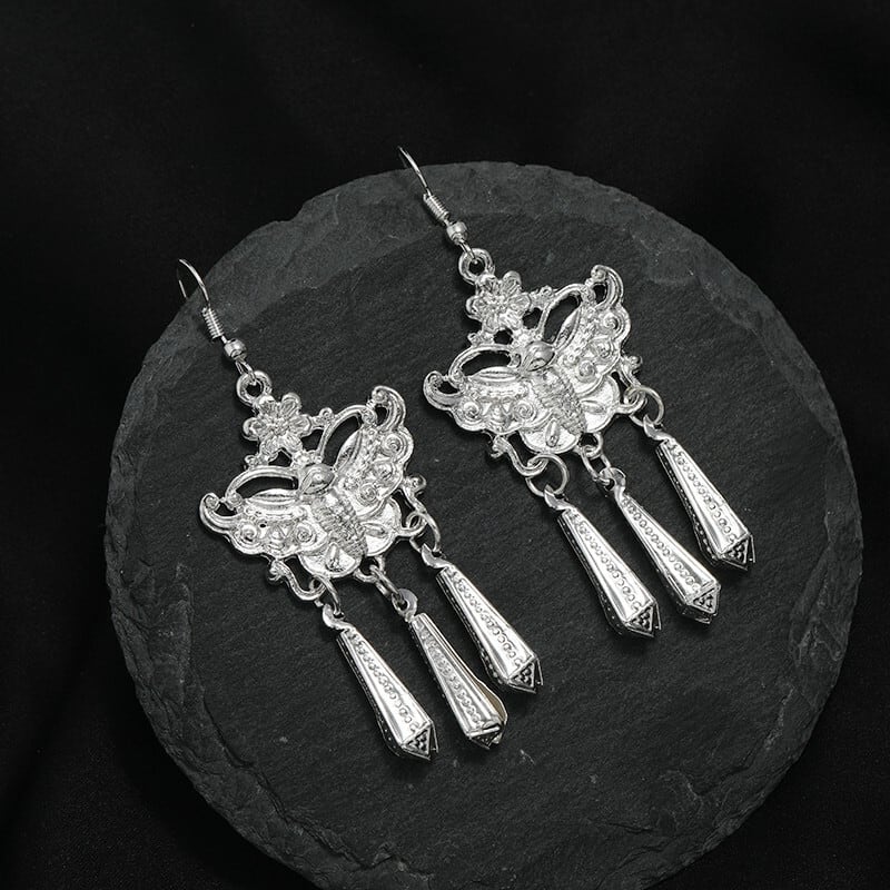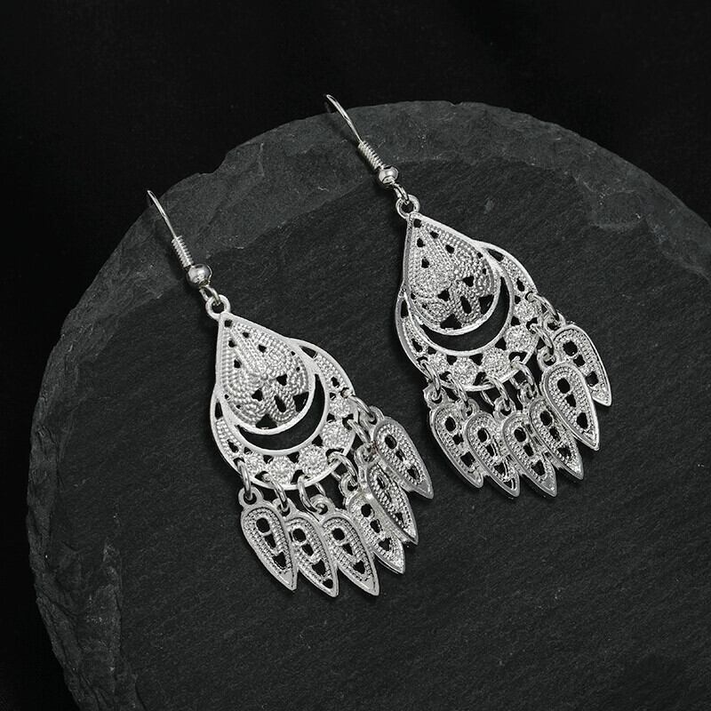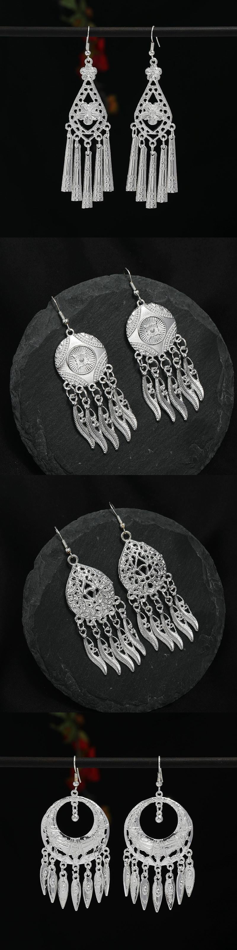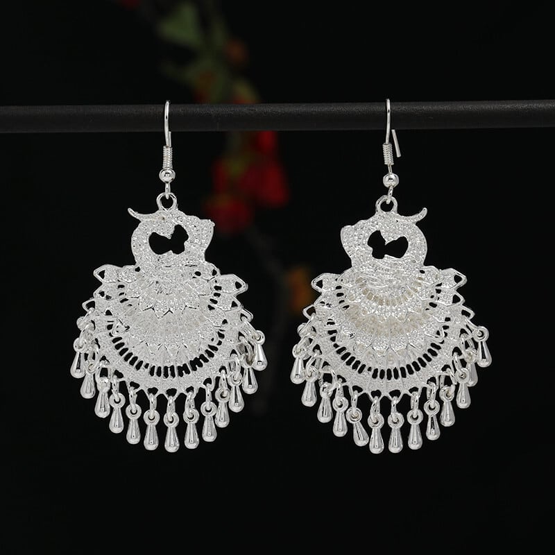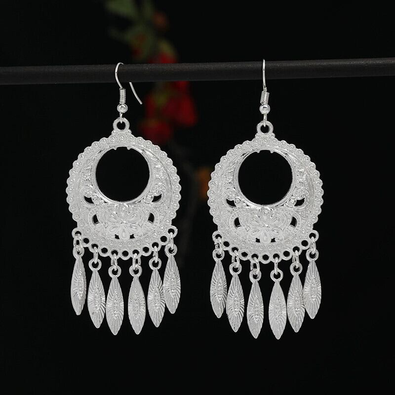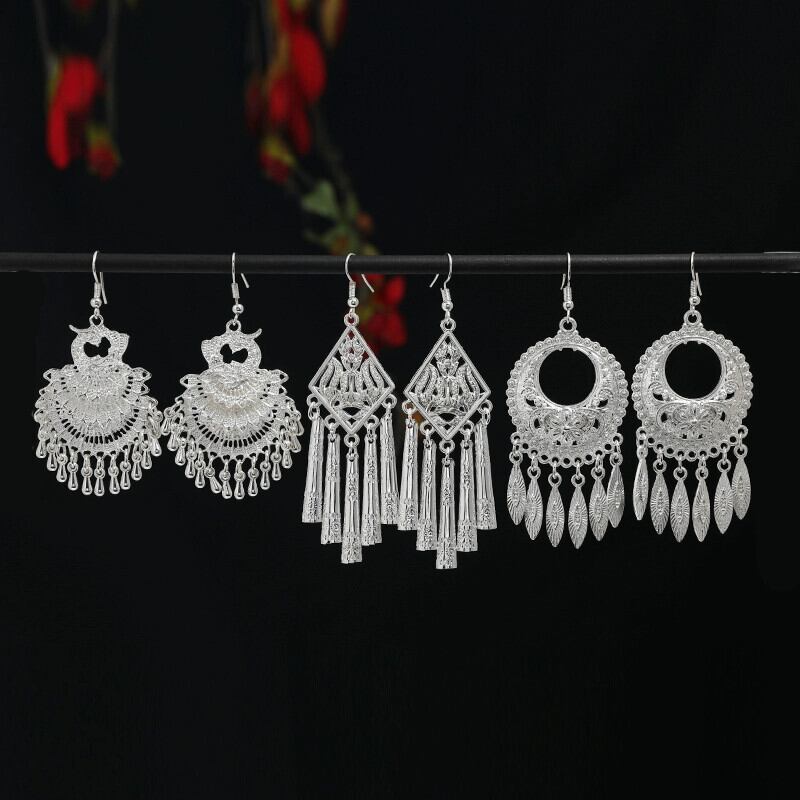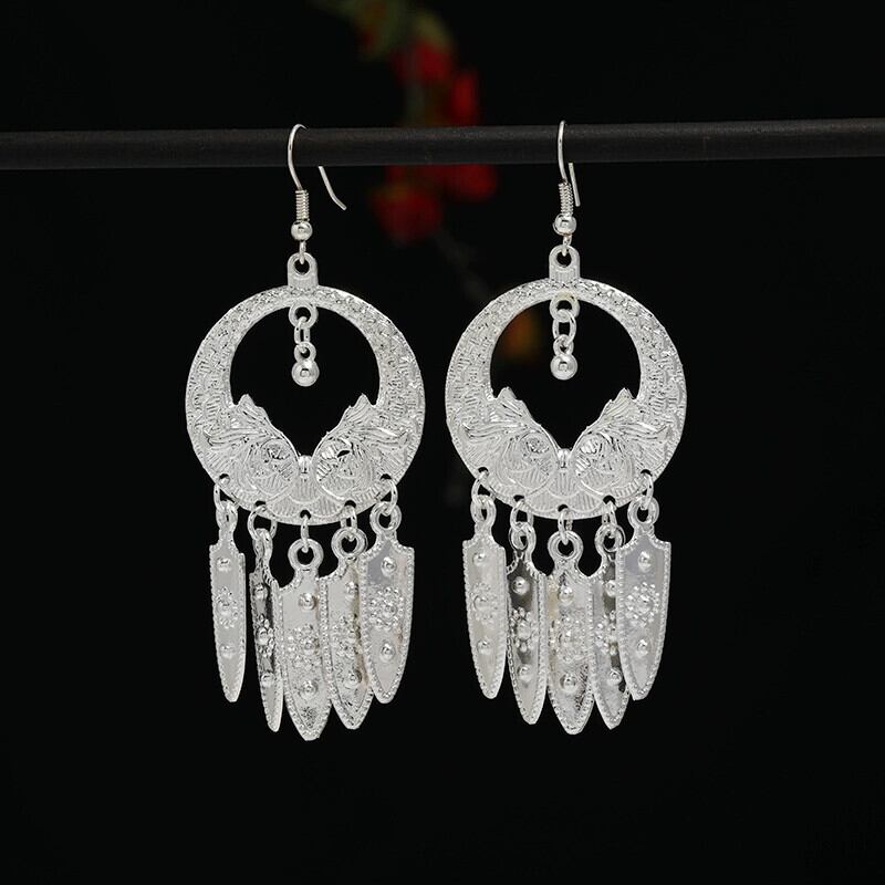 レトロエスニックスタイル手作りミャオ族シルバーテルイヤリング女性らしさ雲南ミャオ族人格ステージ多用途ロングイヤリング 指輪 銀 shipin81554527194