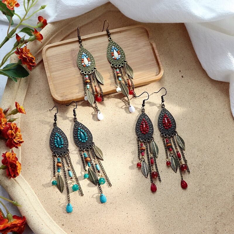 レトロボヘミアロングテルイヤリング女性のエスニック風水イヤリング多用途気質ホリデーイヤリング 指輪 shipin38202458948