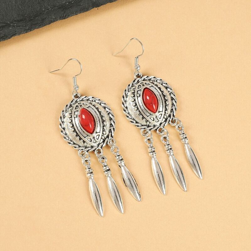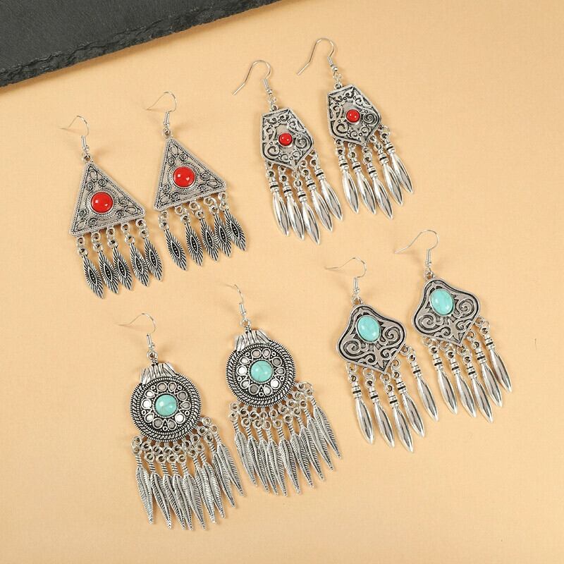 エスニックスタイルレトロミャオ族シルバーテルイヤリングターコイズ象嵌ロングインドスタイルボヘミアンイヤリング女性エキゾチックイヤリング 指輪 銀 shipin35391329532