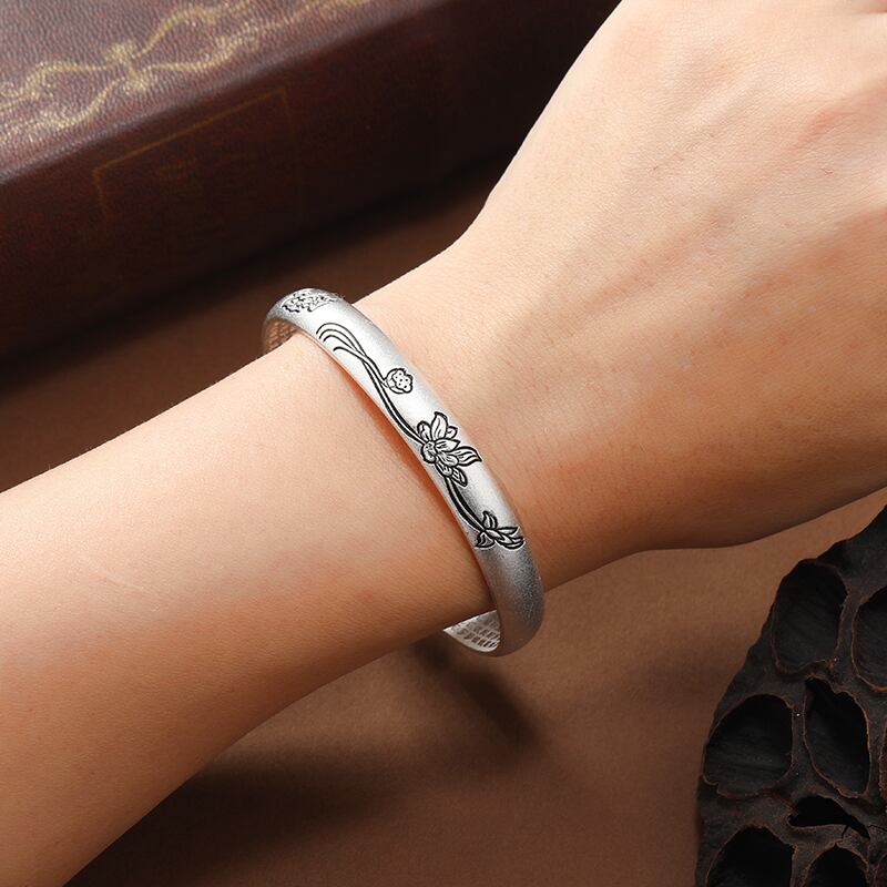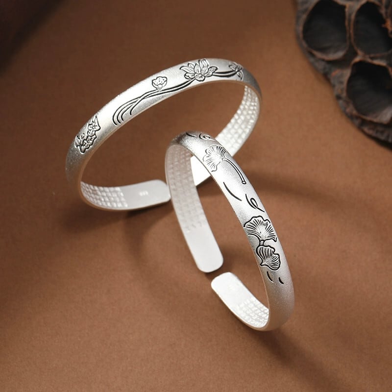 ロータス経典シルバーブレスレットレディース、レトロなソリッドオープニング、古代スタイルのマットシンプルで多用途なエスニックスタイルのイチョウの葉のブレスレット ソリッドカラー 銀 shipin43664871340