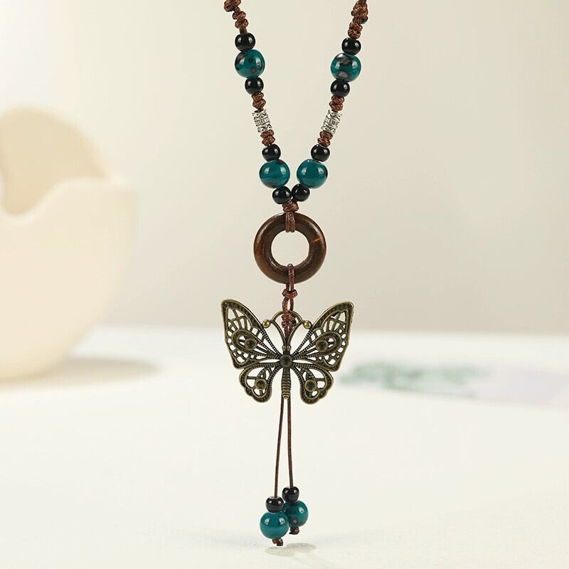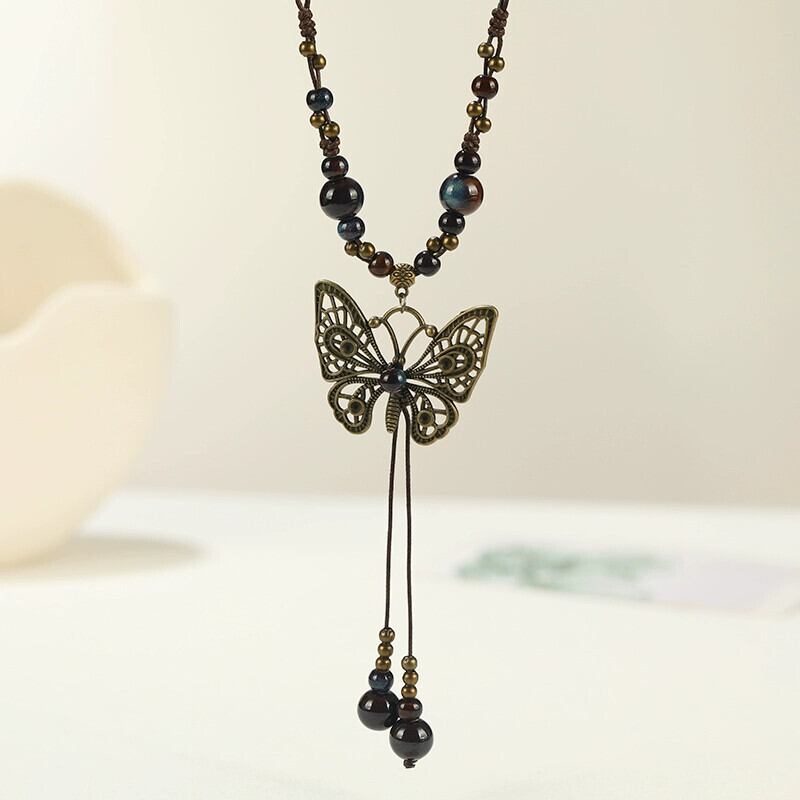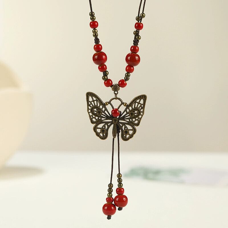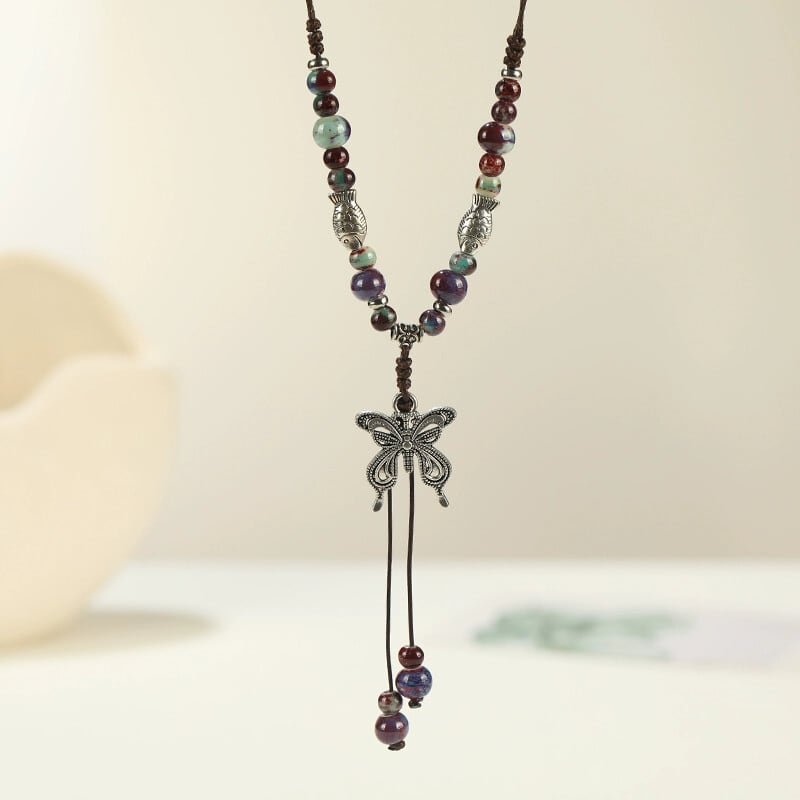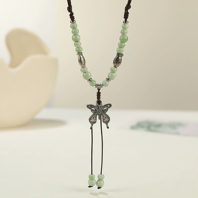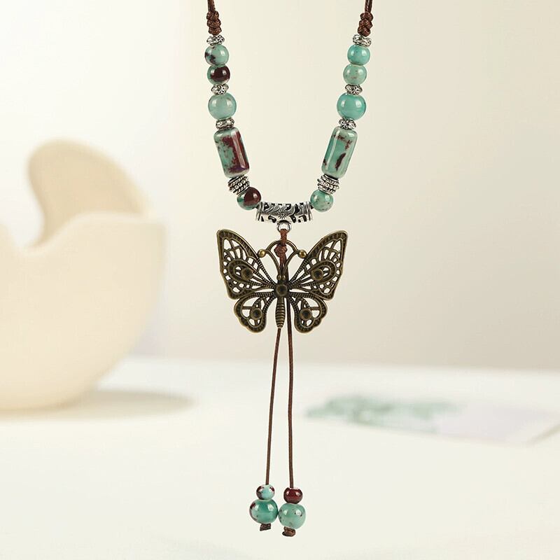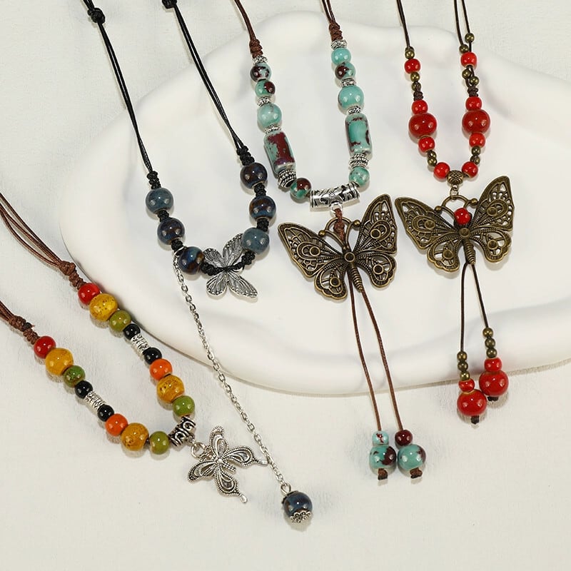 中国風のレトロ文学セラミック蝶ネックレス女性のエスニックスタイルロングテルセーターチェーンアクセサリー鎖骨チェーン レース shipin42366411505