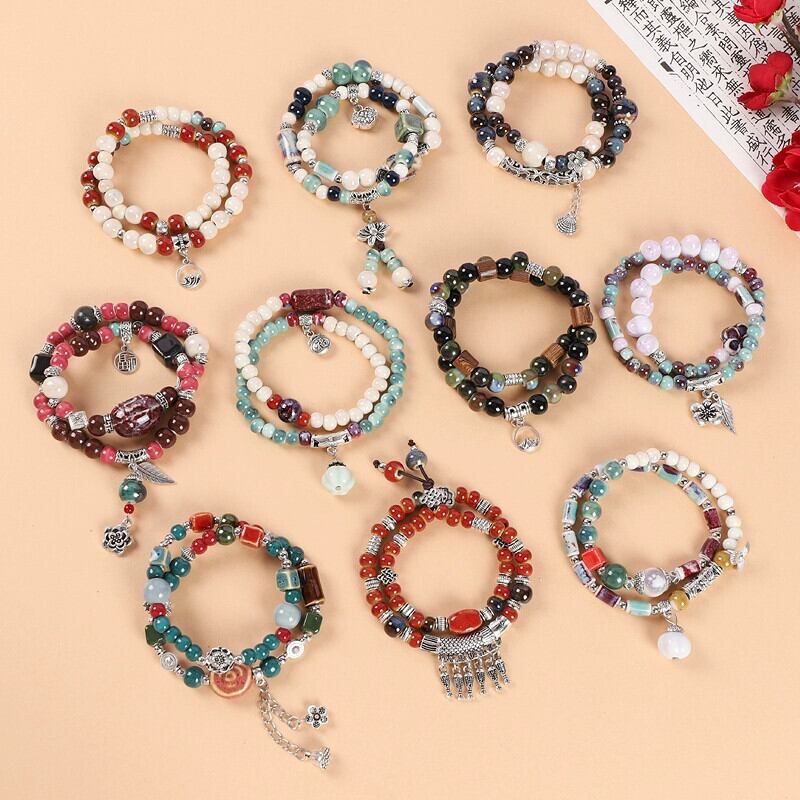 中国風の二層セラミックビーズブレスレット男性と女性、レトロな文学と国家スタイルのニッチブレスレット、エスニックスタイルのアクセサリー レッド shipin97268948741