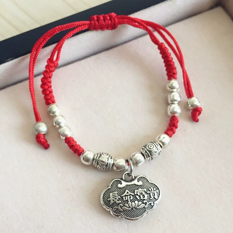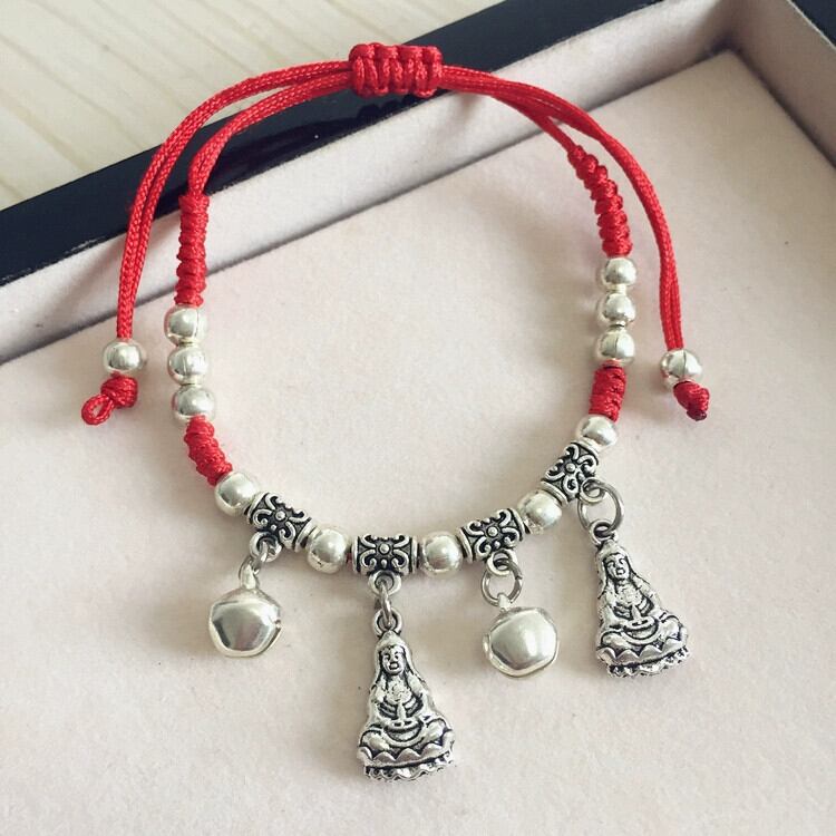 レトロなエスニックスタイルの赤いロープブレスレット小さな新鮮なカップルベル長寿命ロック安全アンクレット手作り隠しシルバージュエリー ロング レッド 銀 shipin40549396409
