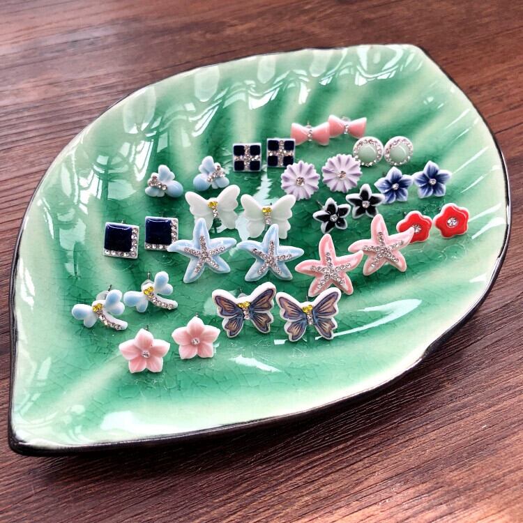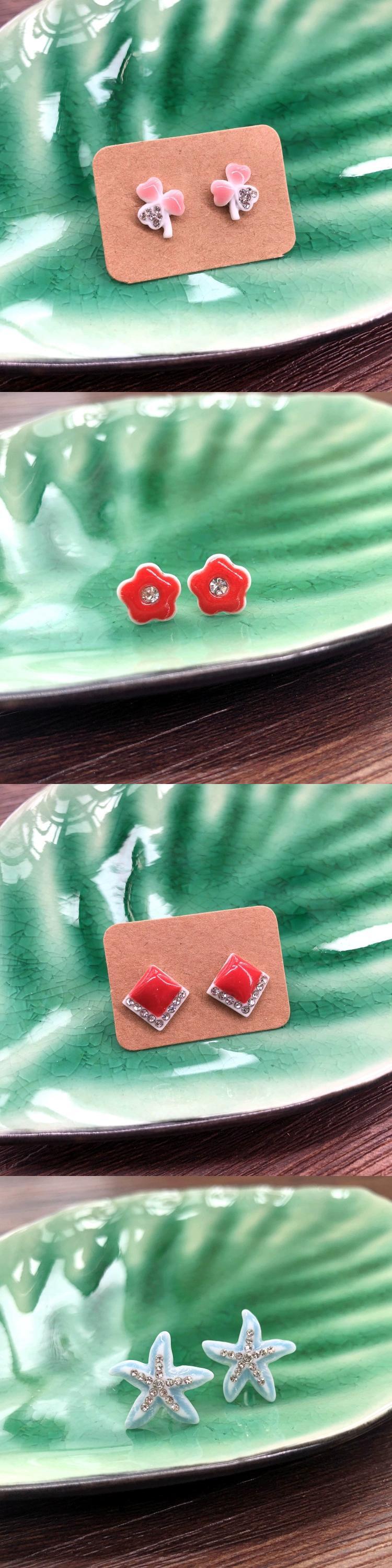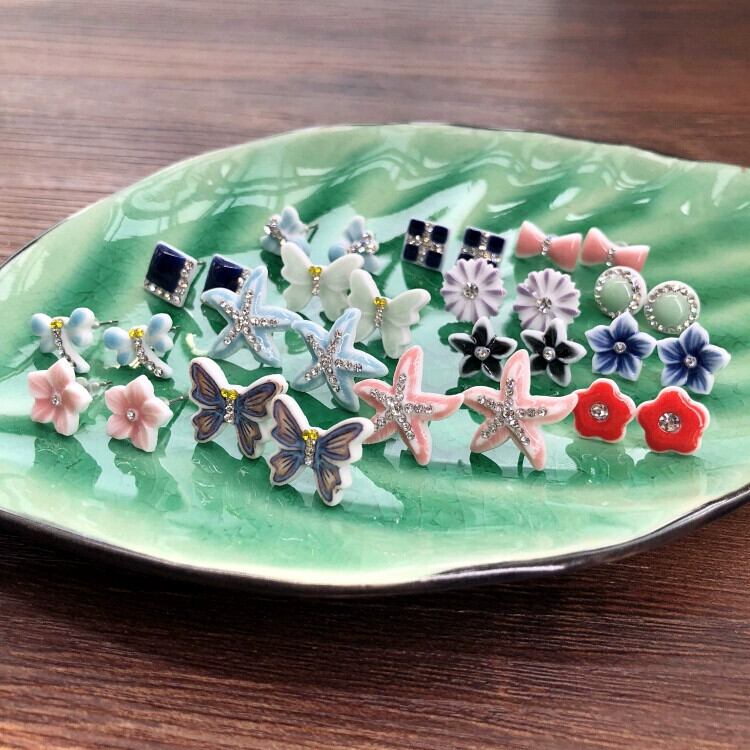 スイート、フレッシュ、レトロ、ハンドメイド セラミック イヤリング、きらめくダイヤモンド、手描きの蝶、花、エスト スタイル、万能イヤー アクセサリー 大人ガーリー スウィート キュート カジュアル 指輪 フラワーデザイン shipin76033309848