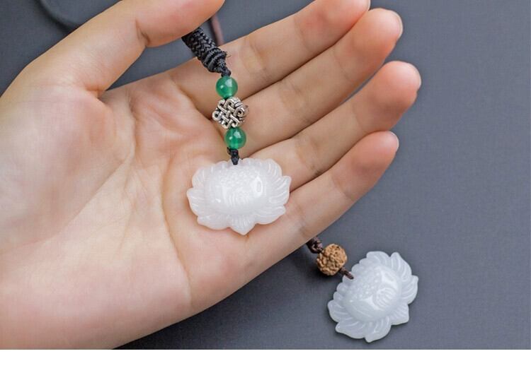 レトロエスニックスタイルロングヒスイロータスネックレス多用途シンプルなセーターチェーンカップルペンダントアクセサリー レース ジェード 翡翠 shipin42480926815