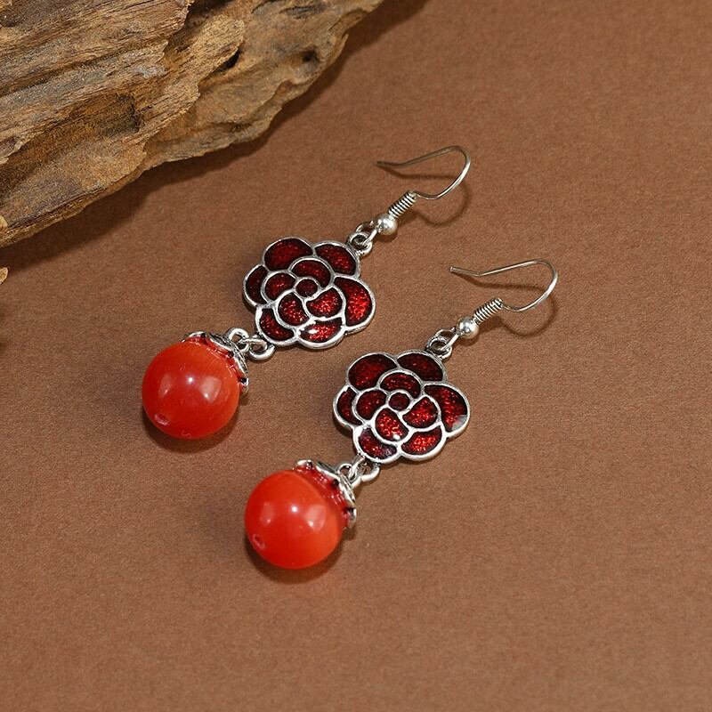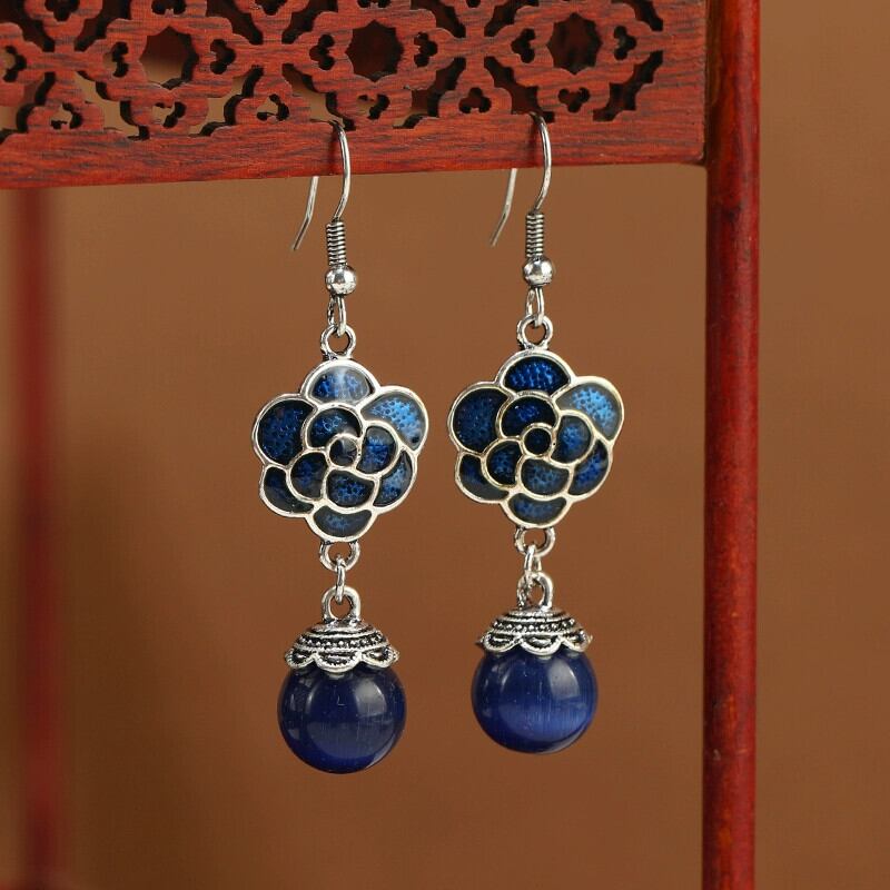 ニッチデザインの新作チャイナフラワーピアス、フェミニンでシンプルなキャッツアイピアス、アンティーク風エスニックスタイルのロングピアス イヤリング リング 指輪 フラワーデザイン shipin28329673317