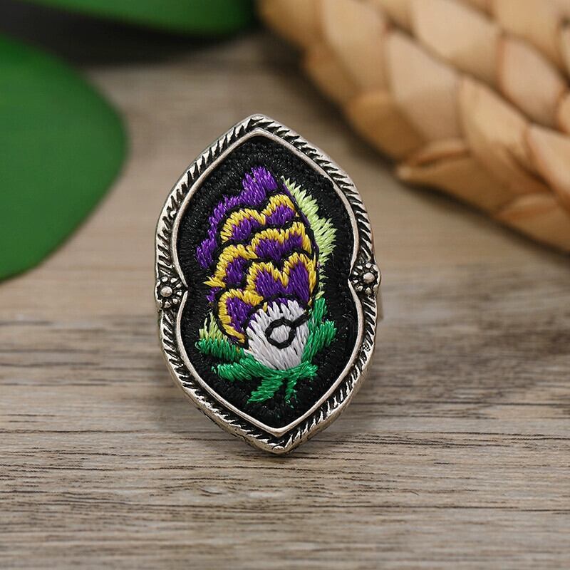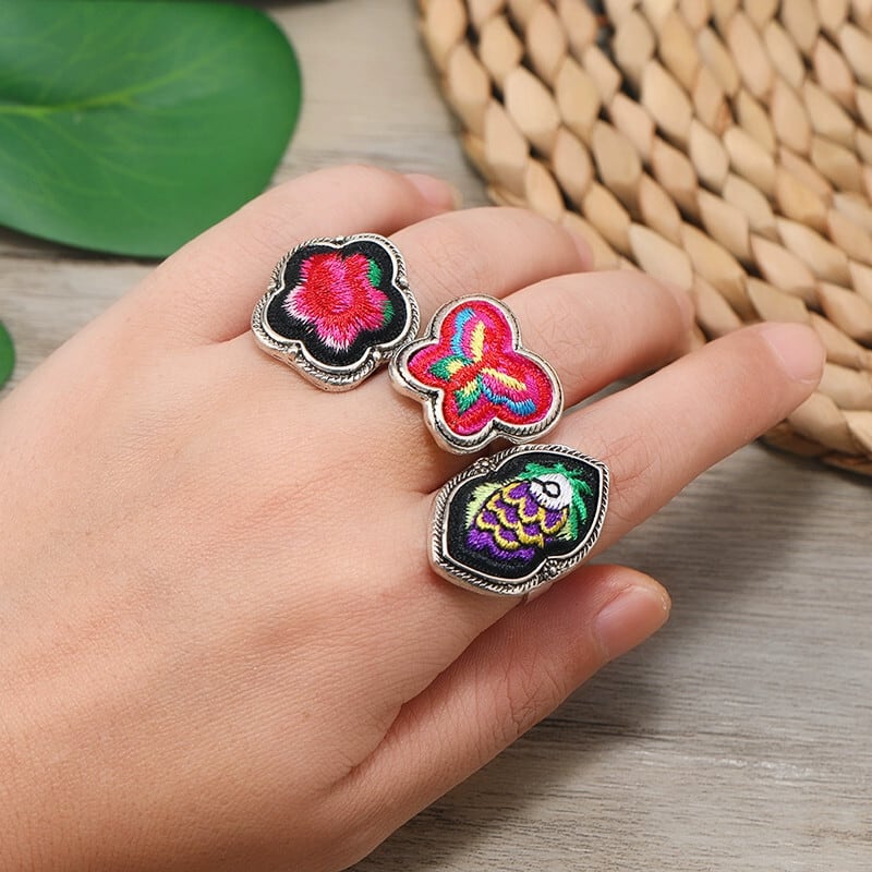 エスニックスタイル手作りミャオ族シルバー刺繍レトロリング古い刺繍蝶の花オープンリング女性ニッチ多目的アクセサリー レッド 指輪 フラワーデザイン 銀 shipin65478204874
