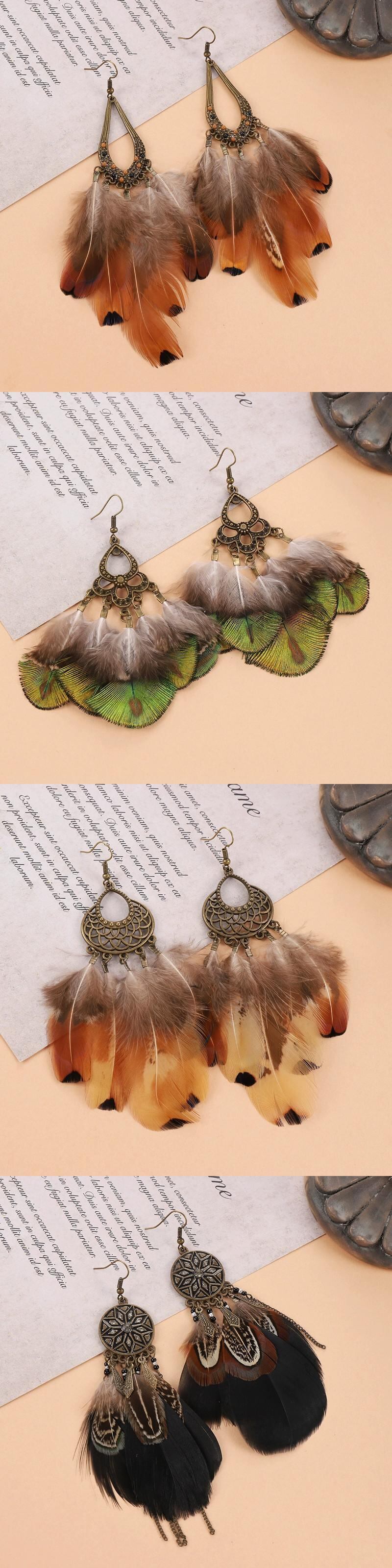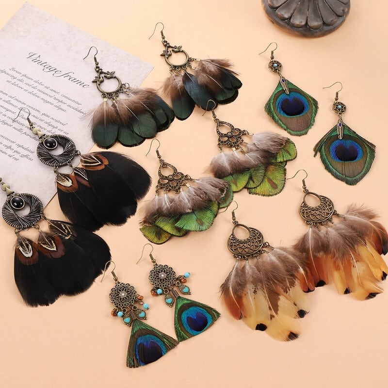 レトロ孔雀の羽のテルイヤリングボヘミアンニッチデザインホリデーエスニックスタイルの長い気質イヤリング女性 ロング 指輪 shipin69095024429